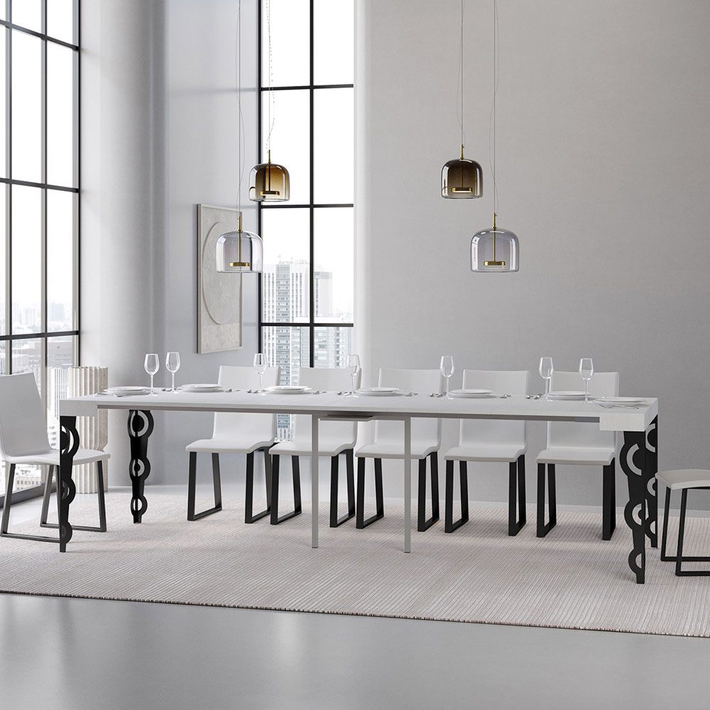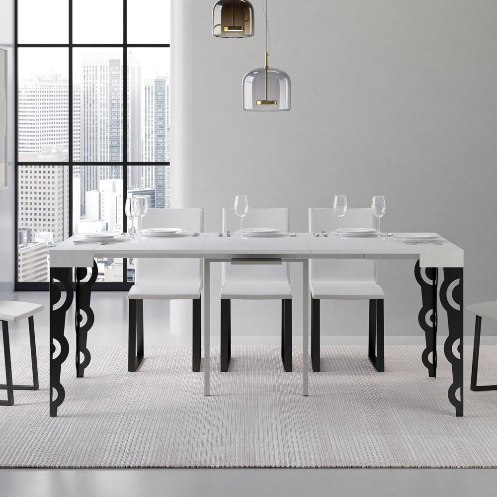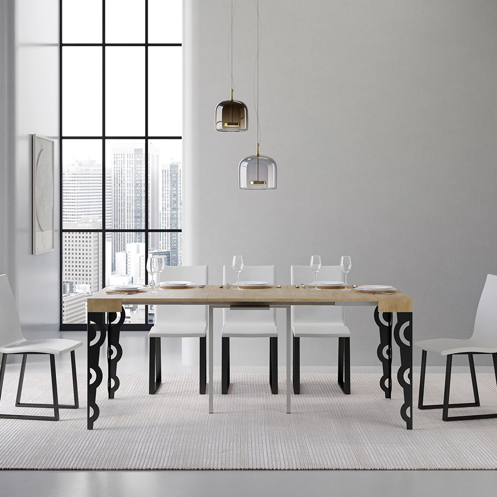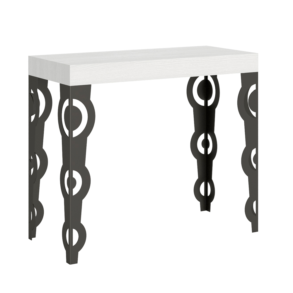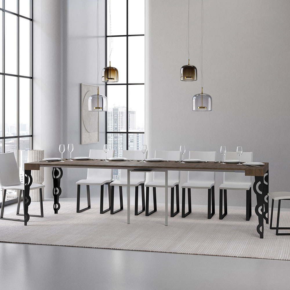 Esta consola extensible es una audaz declaración de estilo y diseño. Su parte superior le da un aire urbano y moderno, mientras que las patas esculpidas cuentan con un intrincado patrón que recuerda a las obras de arte Art Decò, dando a la pieza una personalidad y un atractivo visual.