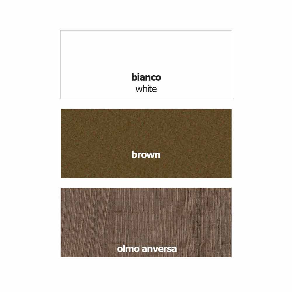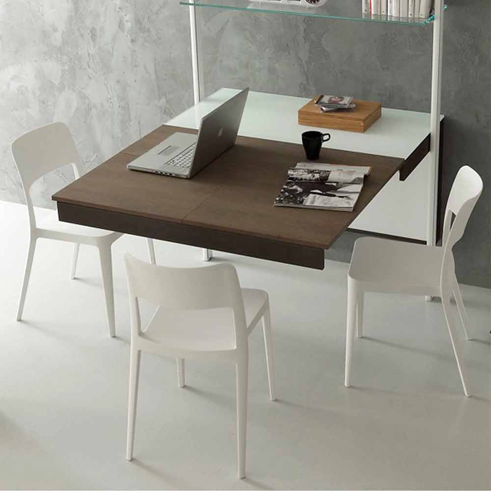 Consola extensible con fijación a pared fabricada en Italia con tapa de cristal blanco brillante equipada con guías para cables y prolongación de 45 cm en melamina acabado olmo , estructura en metal pintado marrón y panel vertical extraíble en plexiglás blanco .