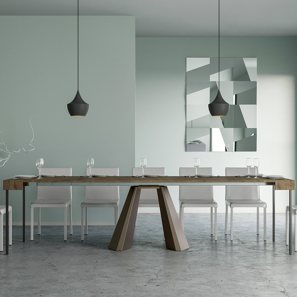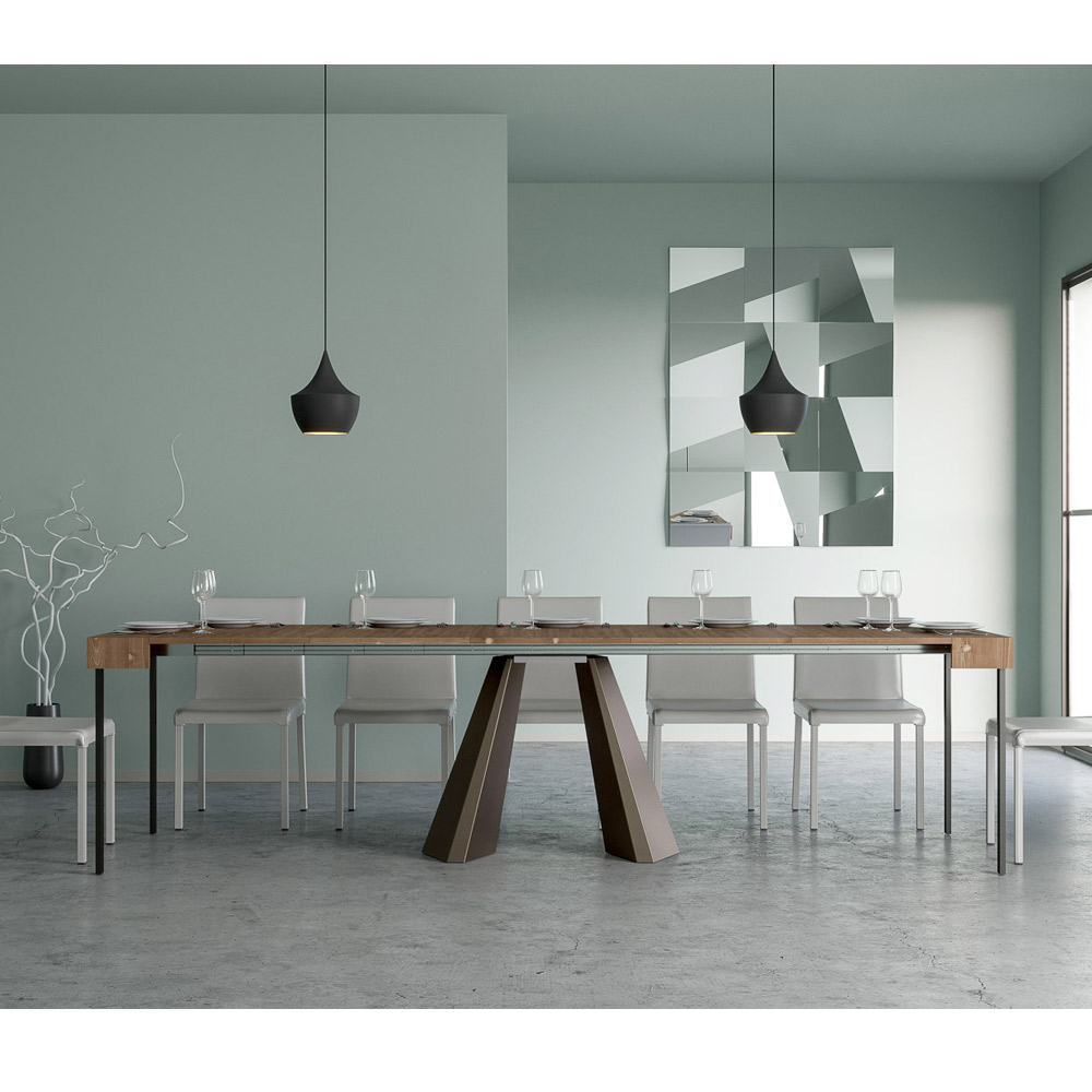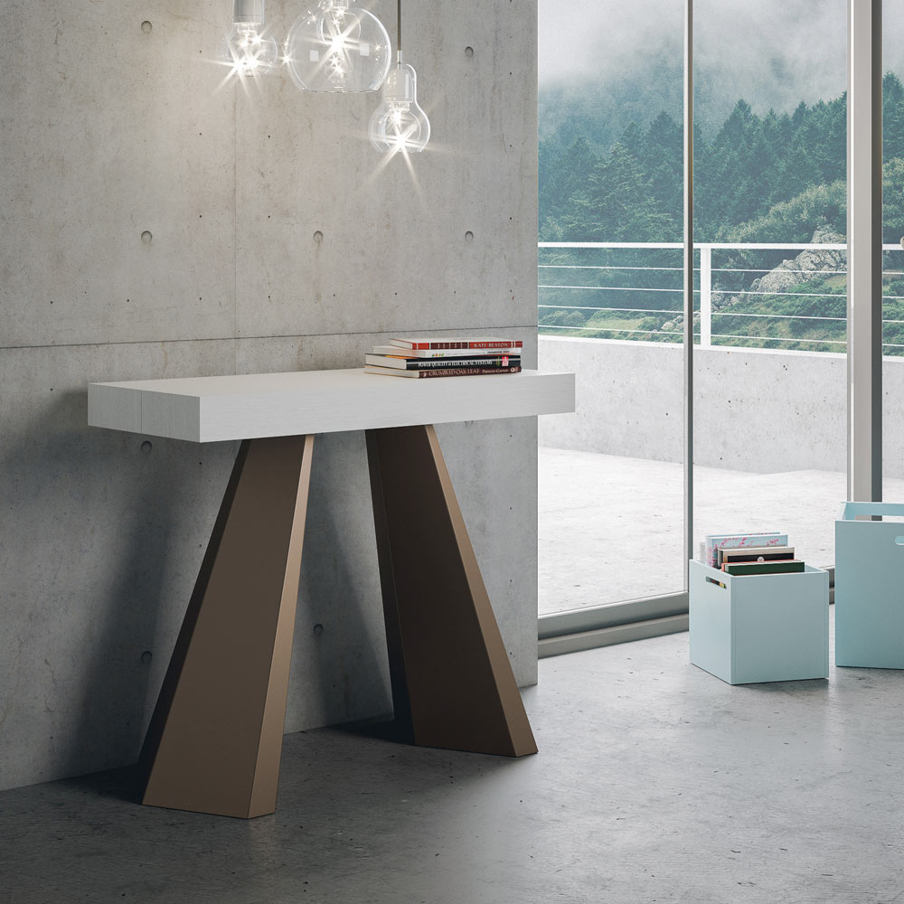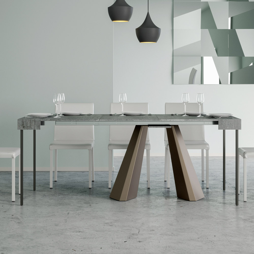 La singularidad de esta consola reside en sus patas, que recuerdan las formas geométricas de la arquitectura moderna, ofreciendo un aspecto escultural y vanguardista. Gracias a su sistema extensible, esta pieza transforma cualquier espacio de sencillo a extraordinario, extendiéndose para acomodar los momentos sociales o para proporcionar esa superficie extra que necesitas.