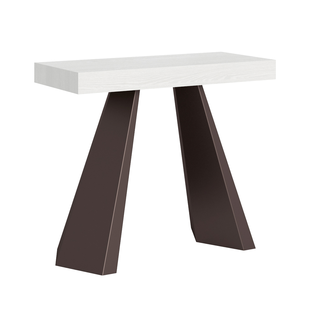 Esta consola extensible es una oda al diseño contemporáneo y a la funcionalidad dinámica. La superficie de madera acabada, finamente trabajada para resaltar las vetas naturales, descansa sobre dos robustas patas inclinadas de hierro, creando un contraste visual tan audaz como armónico.