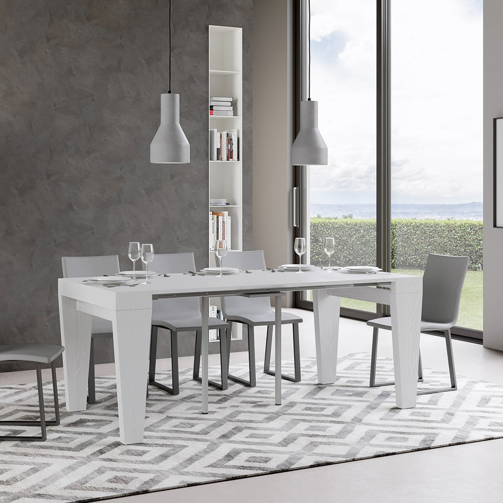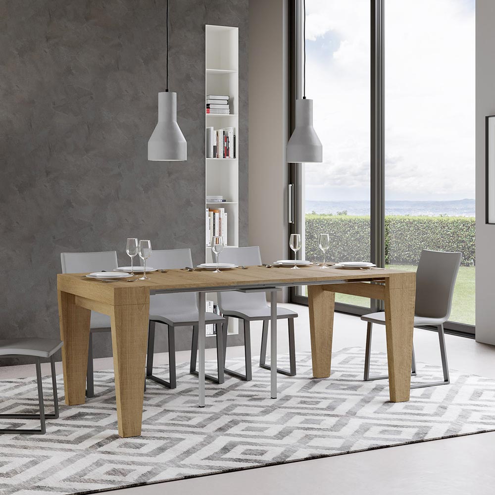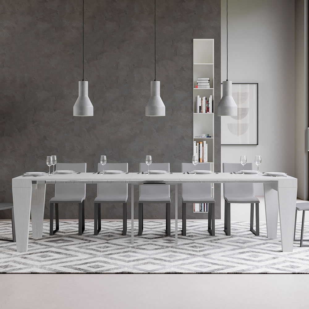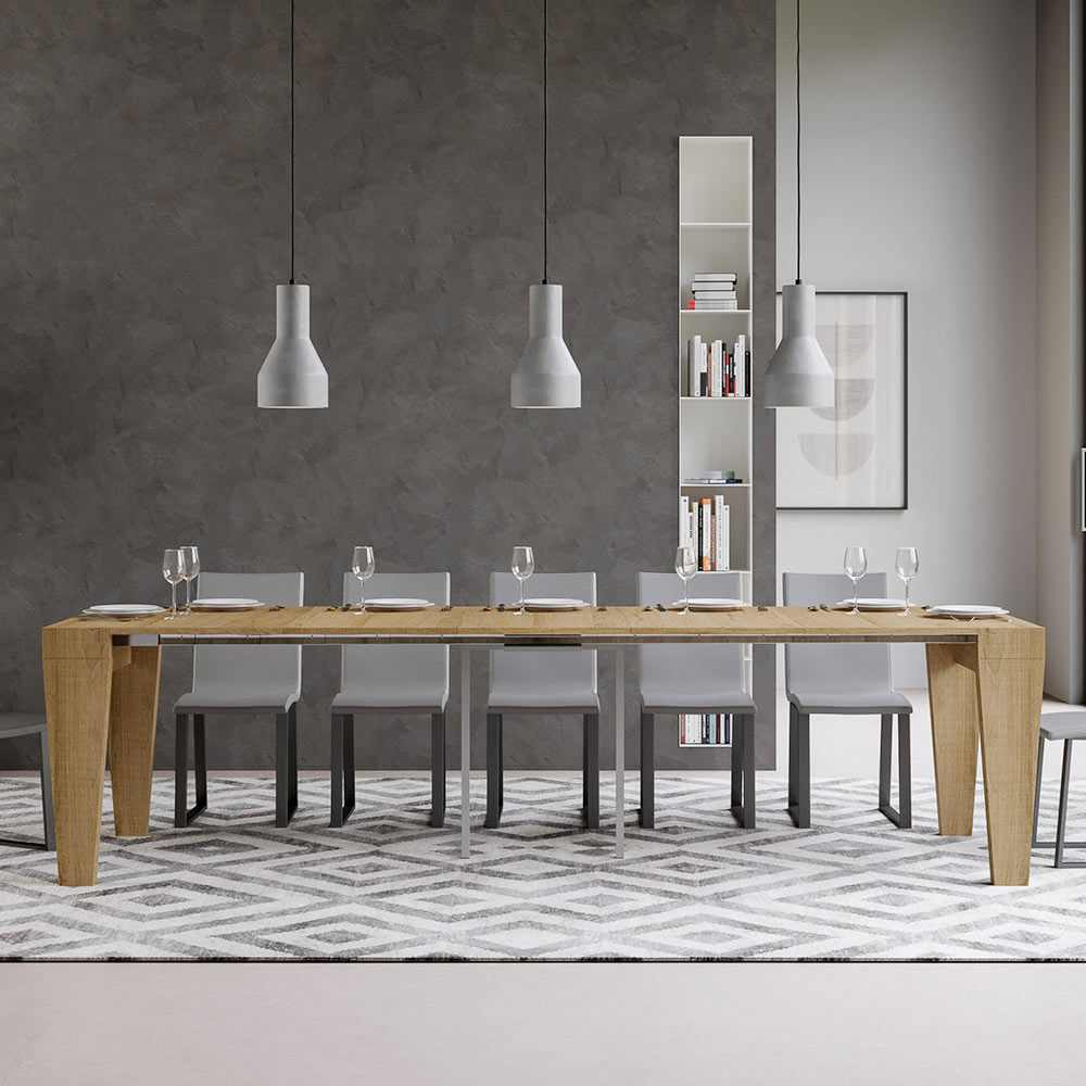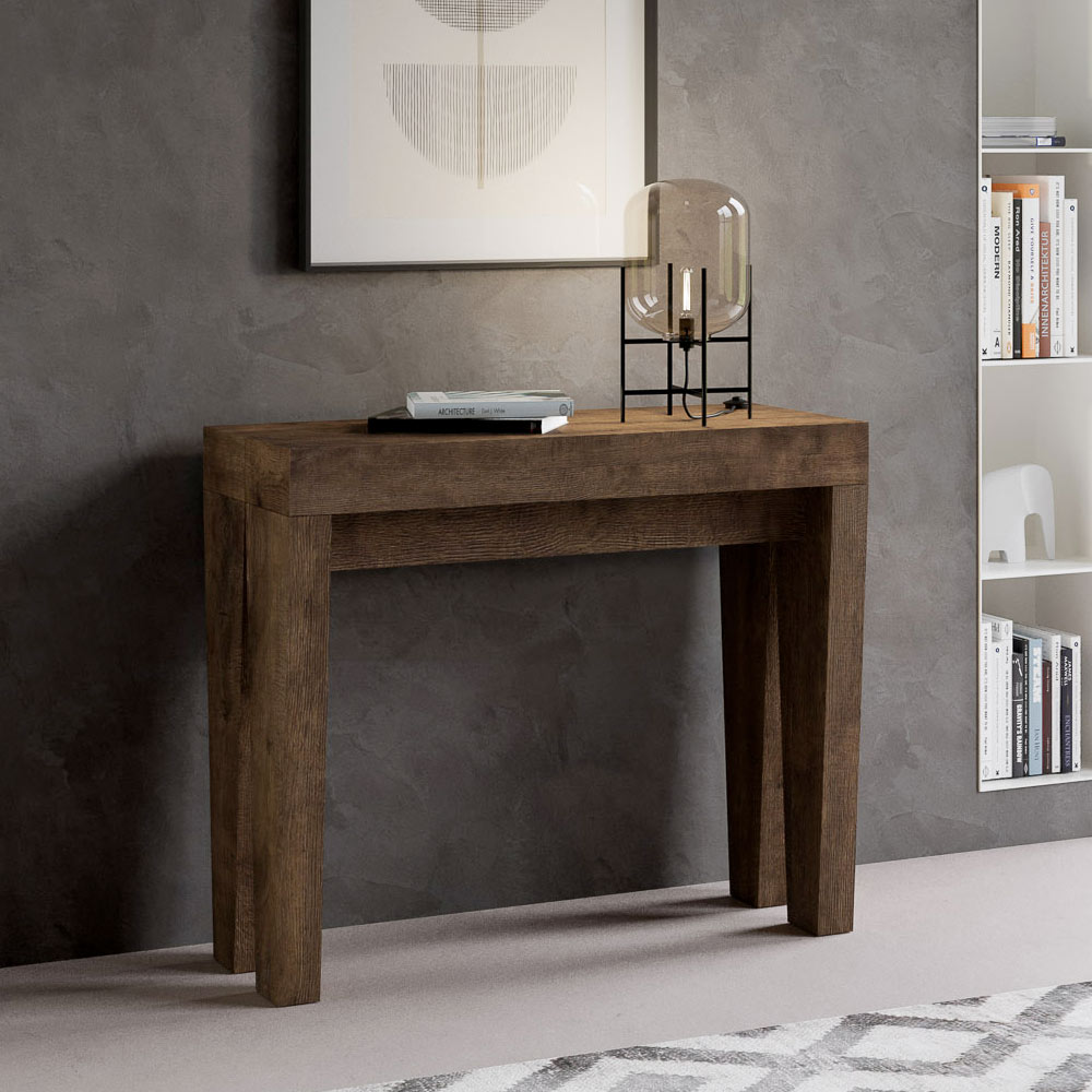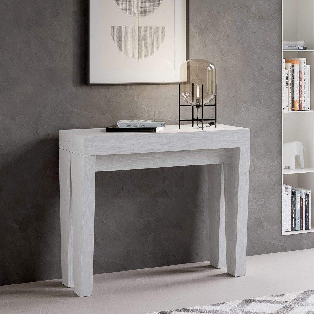 Esta mesa consola extensible es ideal para optimizar el espacio: compacta cuando está cerrada, se extiende fácilmente para proporcionar una superficie de trabajo o para una cena, convirtiéndose en un símbolo de versatilidad y adaptabilidad. È diseñado para aquellos que buscan una combinación de practicidadà y estilo sofisticado en sus muebles.