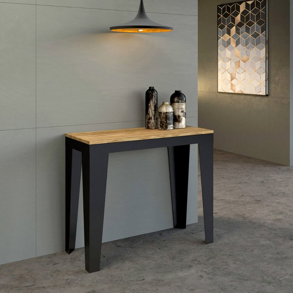 Esta consola extensible es la quintaesencia del ingenio y el diseño elegante. Su aspecto sofisticado viene dado por la combinación de líneas nítidas y colores contrastantes, con esbeltas patas de metal antracita que soportan un tablero de madera, creando un sorprendente equilibrio visual.