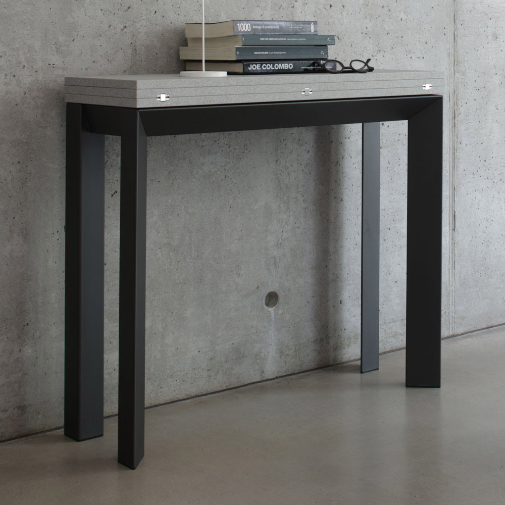 Tiene un diseño limpio y lineal , capaz de integrarse discretamente en cualquier ambiente. Cuando está cerrada, es una consola delgada y refinada, perfecta para la entrada, donde puede acomodar artículos esenciales como llaves y billeteras, o actuar como expositor para sus objetos de arte favoritos.