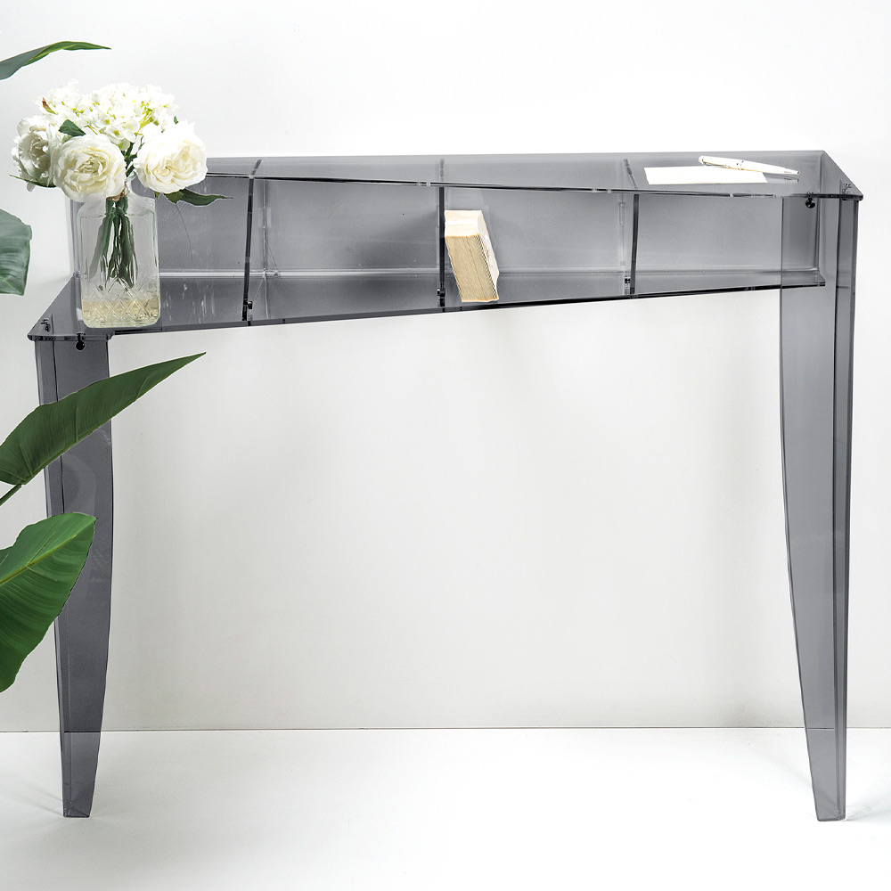 Con su estética discreta pero inolvidable, la consola es lo suficientemente versátil como para llamar la atención sin abrumar a los demás elementos de decoración. Su superficie lisa y transparente es ideal para exhibir obras de arte, marcos de fotos o simplemente mantener organizados las llaves y el correo diario.
