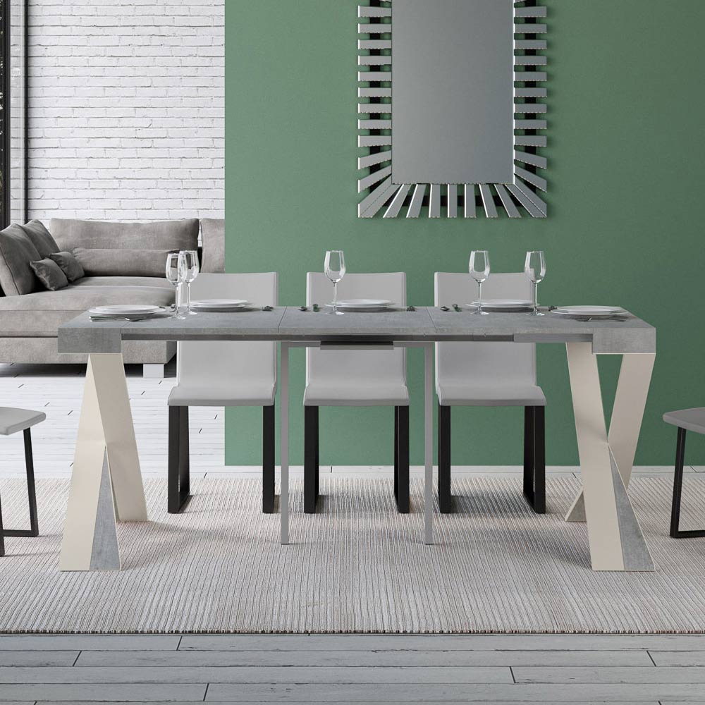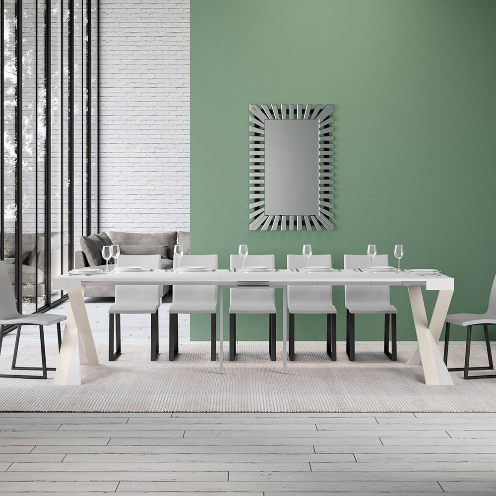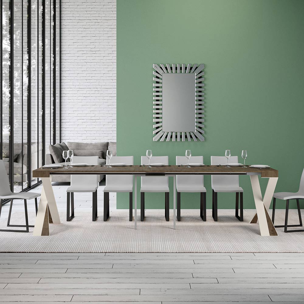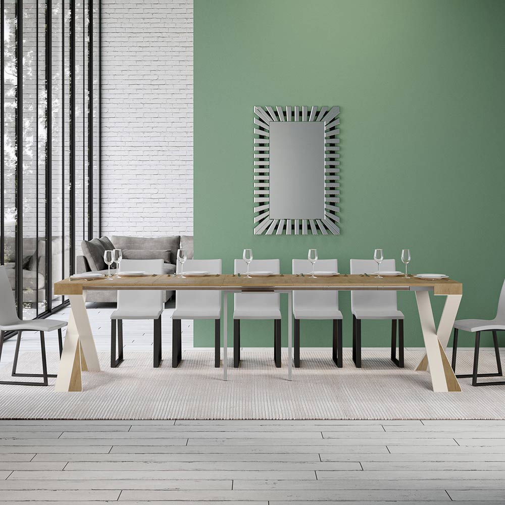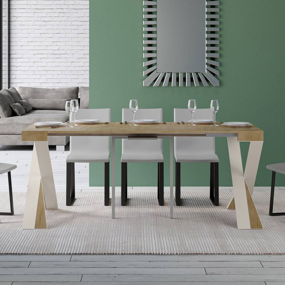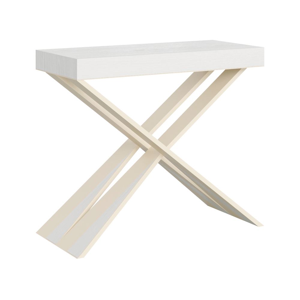Esta mesa consola extensible encarna la elegancia y la funcionalidad en un diseño llamativo. É presenta una silueta moderna con una base en X que no sólo proporciona un soporte sólido, sino que también añade un toque de sofisticada originalidad. La encimera de madera molduradaè un homenaje a la calidad del Made in Italy, apreciado por su durabilidad y capacidad para resistir el paso del tiempo.
