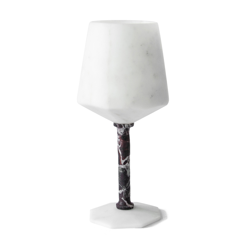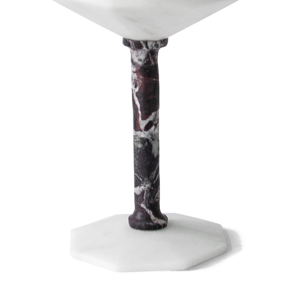 Copa de vino en mármol de Carrara blanco satinado y Levanto rojo, diseño hecho en Italia.