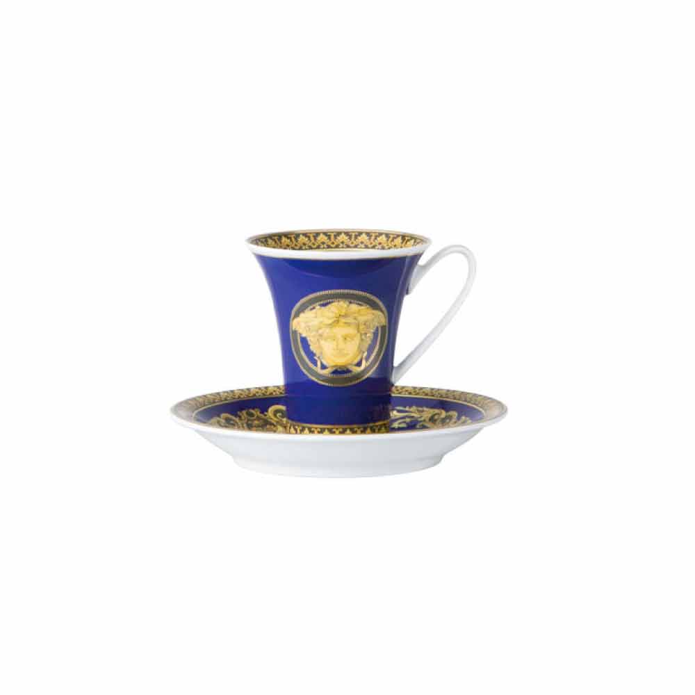 La elegante taza de café y platillo de Versace es parte de la elegante colección moderna que, combinada con un glamour fascinante y refinado, recuerda épocas pasadas y se expresa en el tono brillante del azul y toma el nombre de Medusa Blue.