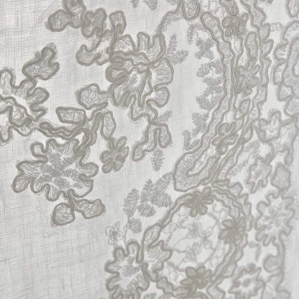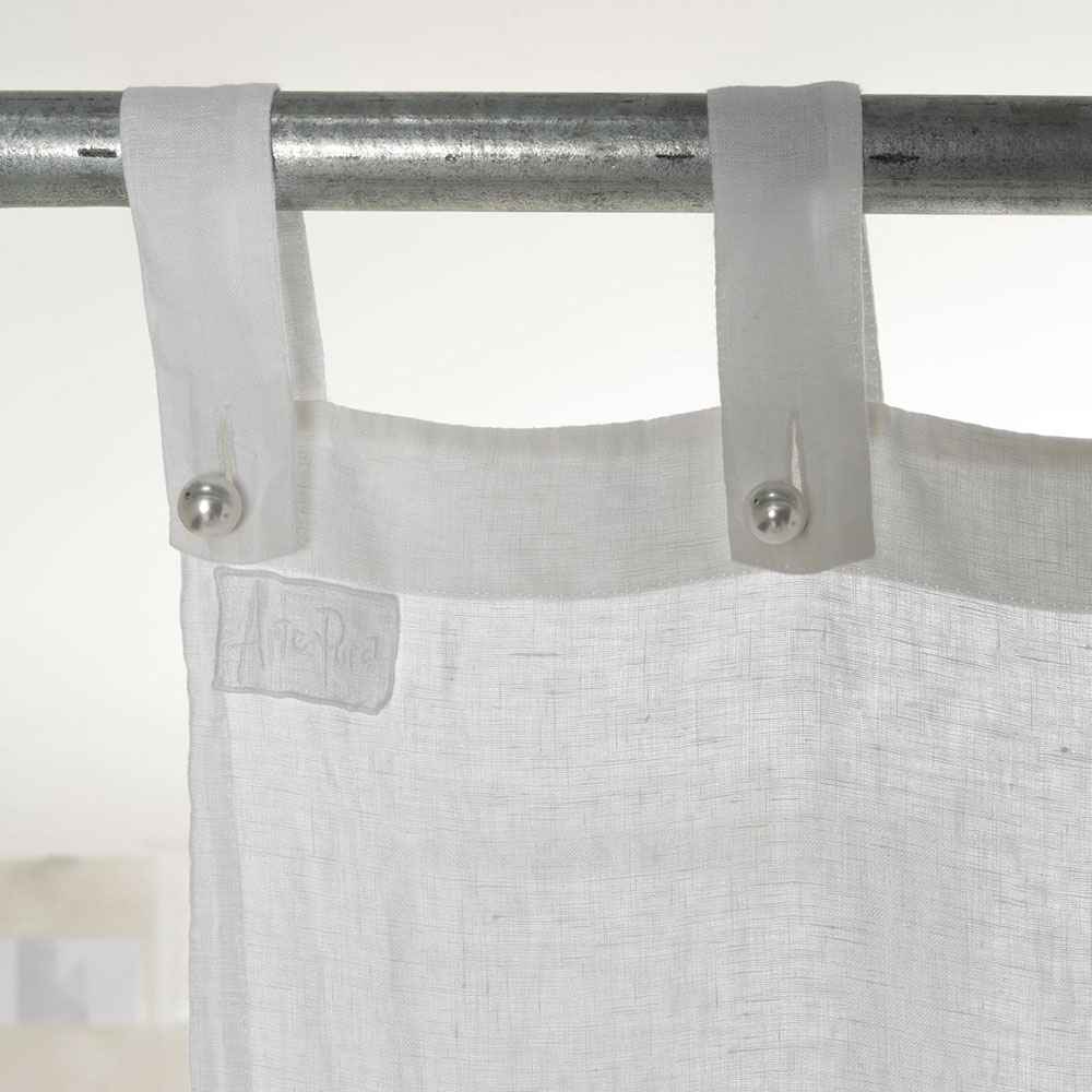 El valor de la tradición se combina con el estilo de vida moderno en esta cortina de lino claro blanco con puntilla central de elegante decoración y lazada con botones de nácar Agoya.