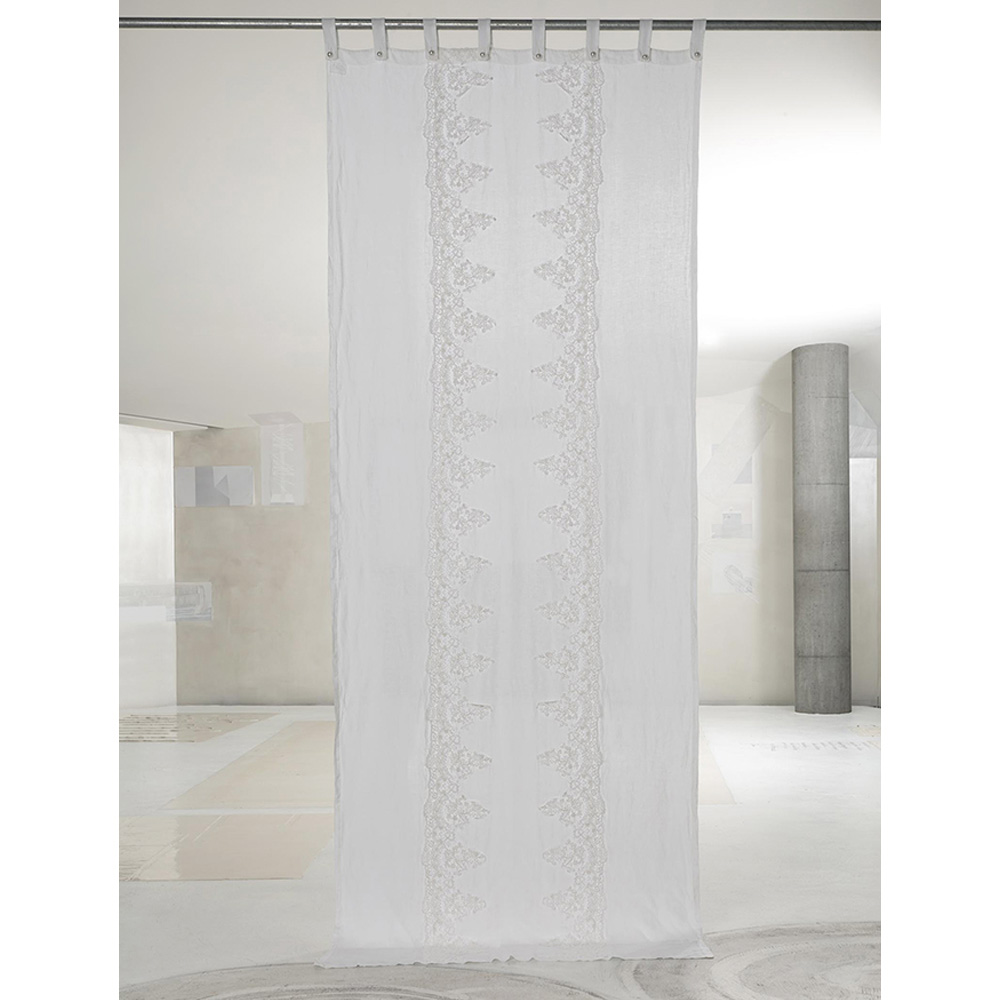 Cortina blanca de lino claro con puntilla central de elegante decoración, calidad artesanal made in Italy.