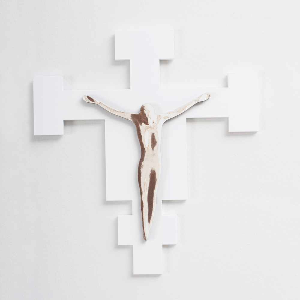 Crucifijo de madera lacada en blanco con aplicación del Cristo de madera lacada en blanco grabado con láser que resalta los detalles del cuerpo.