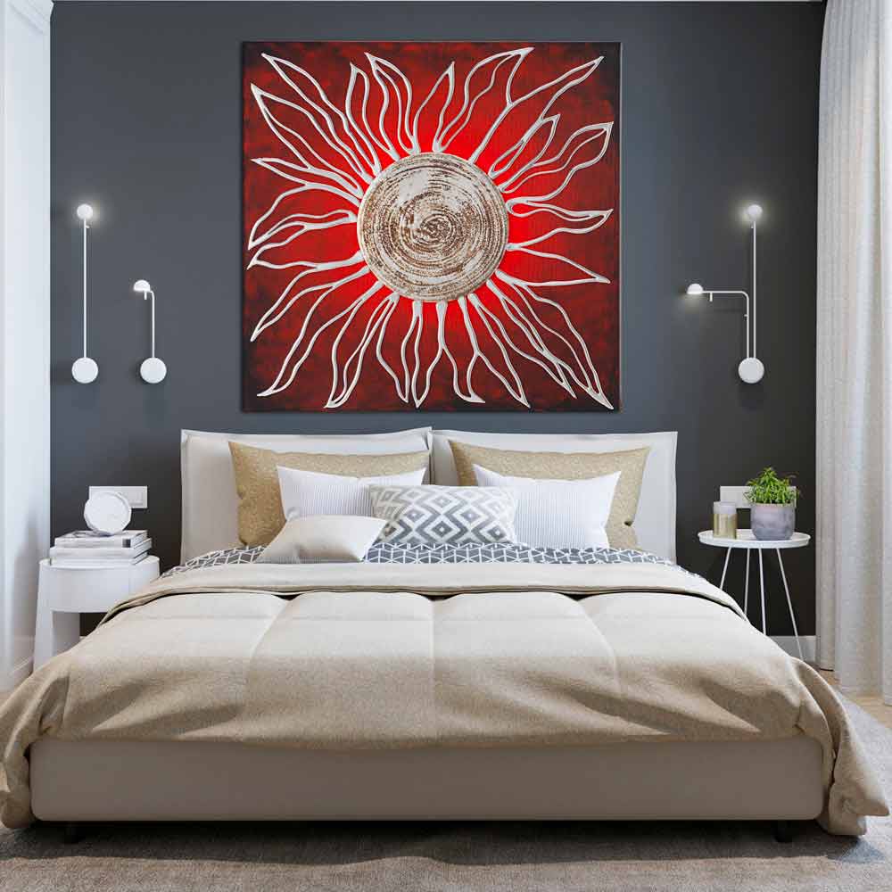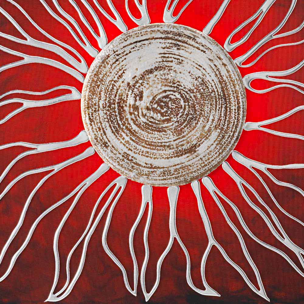 Elementos en relieve decorados a mano con resina, matérico, hoja de plata sobre estructura tela, retoque lúcido.