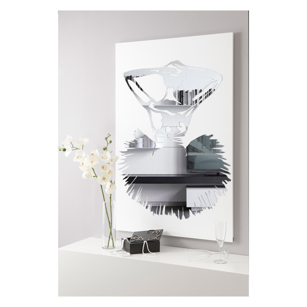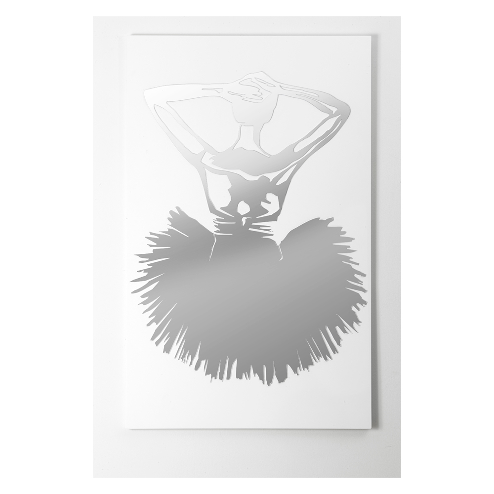El panel decorativo está realizado mediante la técnica de marcado láser que crea un bajorrelieve sobre el material, creando diferentes gradaciones de color. El cuadro está realizado en madera lacada en blanco con decoración de espejo. Representa una bailarina realizada en plexiglás espejo de hecho tiene también funciona como un espejo.
