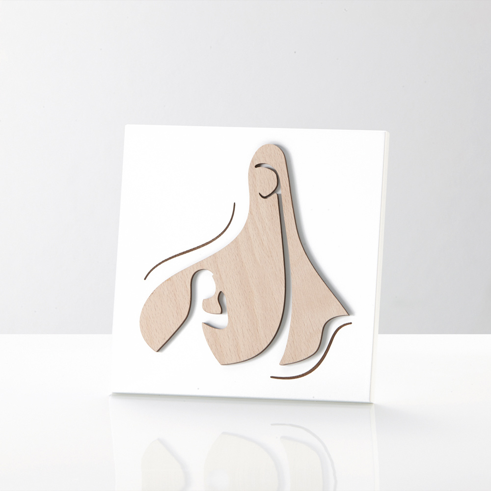 Cuadro sacro que representa la aparición de la Virgen en madera natural y grabado láser. Panel de madera lacado en blanco con pie de apoyo y orificio para colgarlo en la pared..