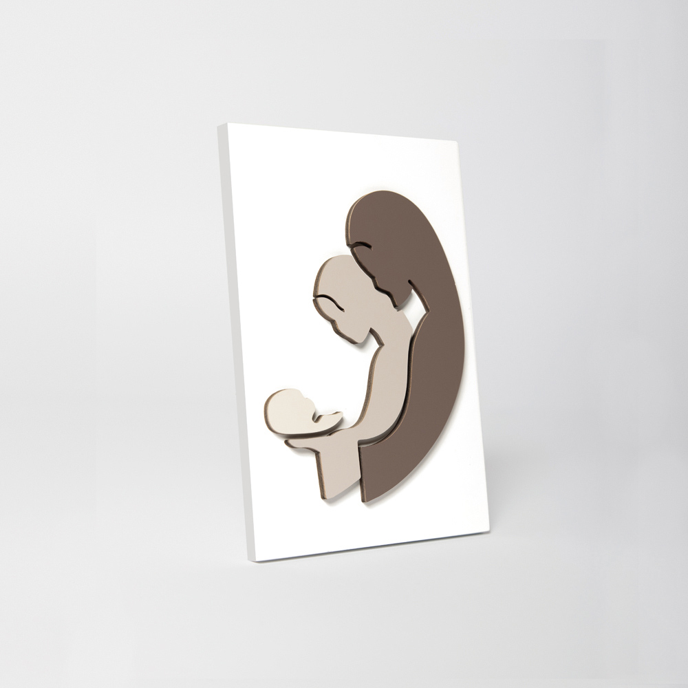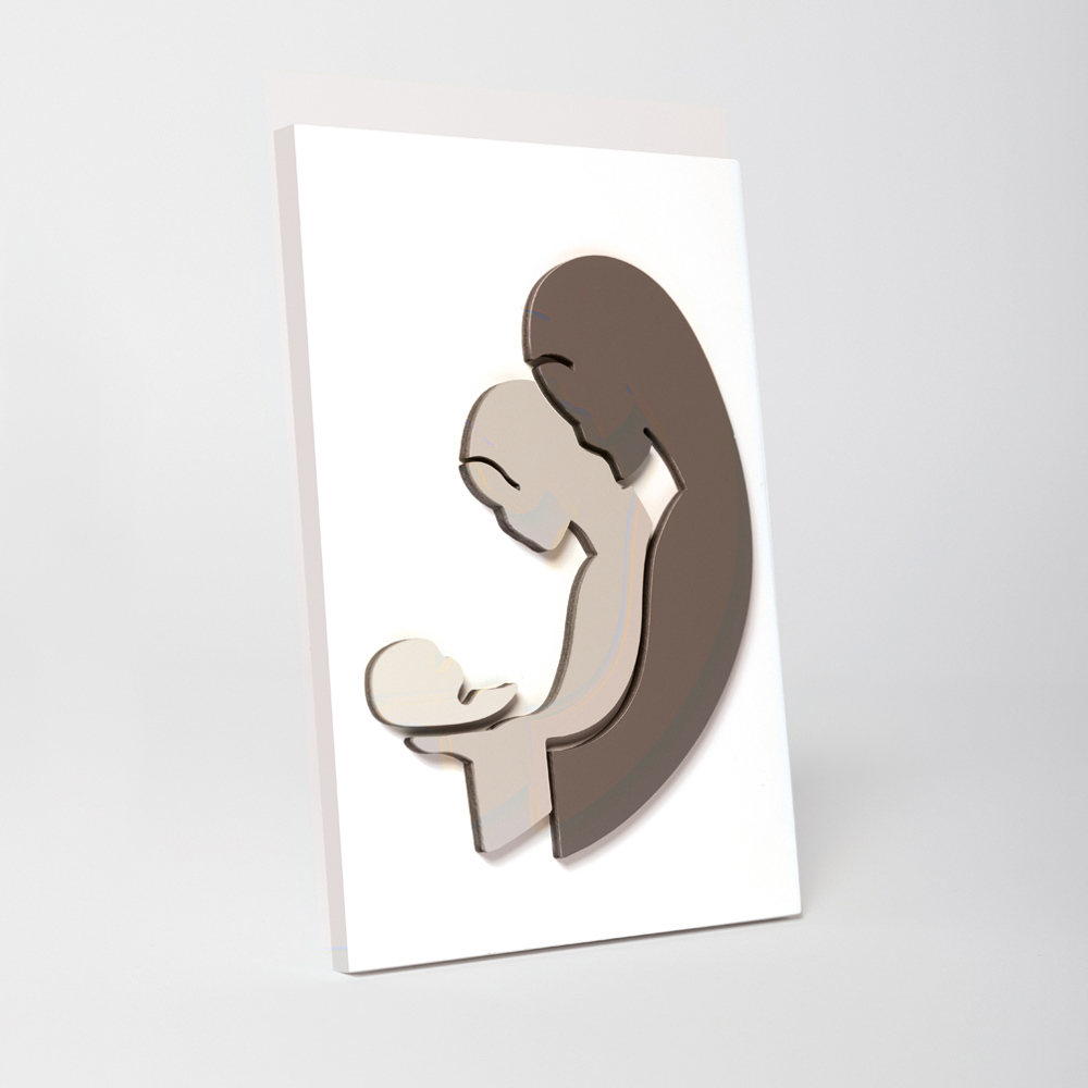 Cuadro sagrado con la sagrada familia aplicada en tres colores: cacao, cascajo y arena . Panel de madera lacada en blanco con pie de apoyo.