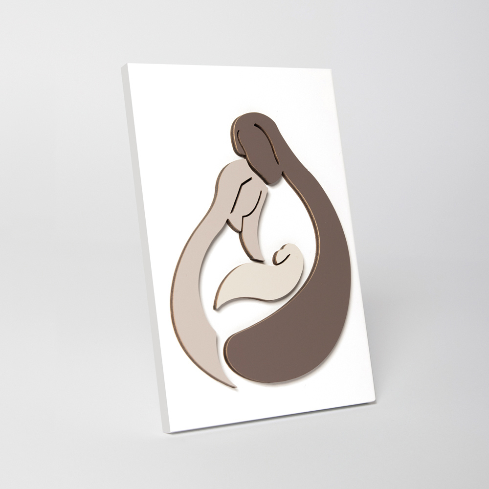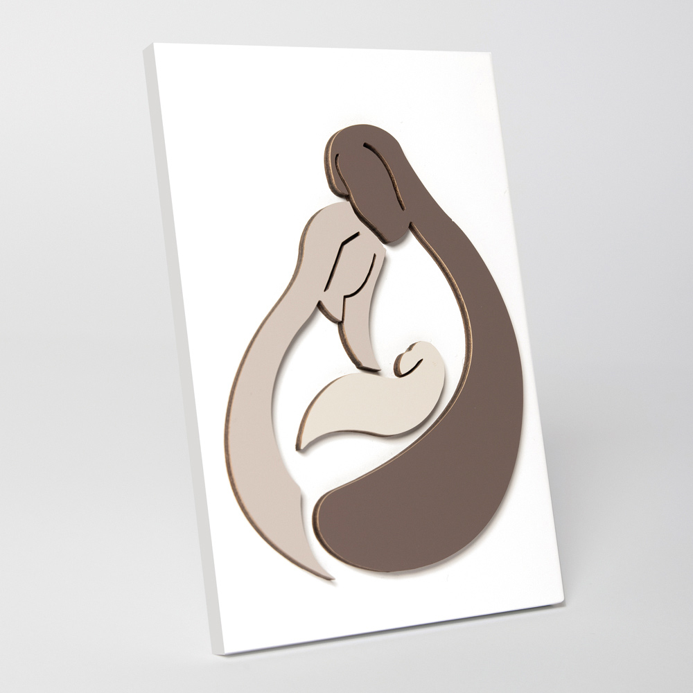 Esta pintura es el resultado de la artesanía italiana, las figuras están dibujadas a mano y luego pintadas con la luz del rayo láser, sin ningún desperdicio y respetando el medio ambiente. Para este elemento, se eligió específicamente un estilo mínimo y esencial para realzar y representar solo el advenimiento de Jesús. La unión de acabados y colores crea un producto único en su género que revela el amor y cariño de la familia.