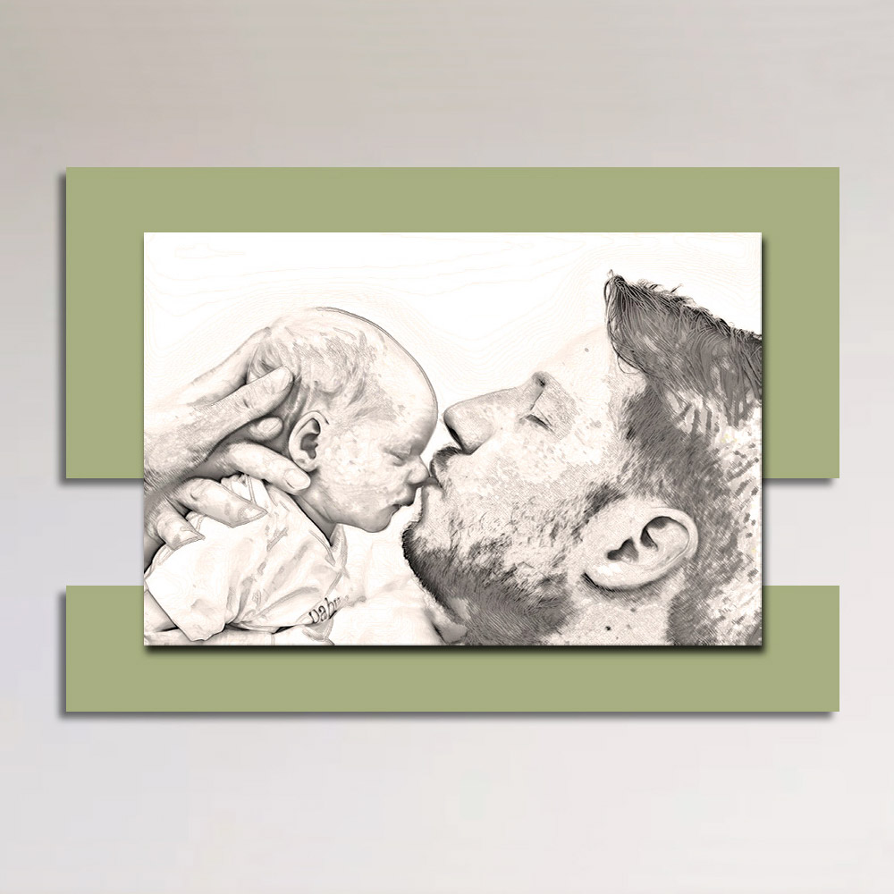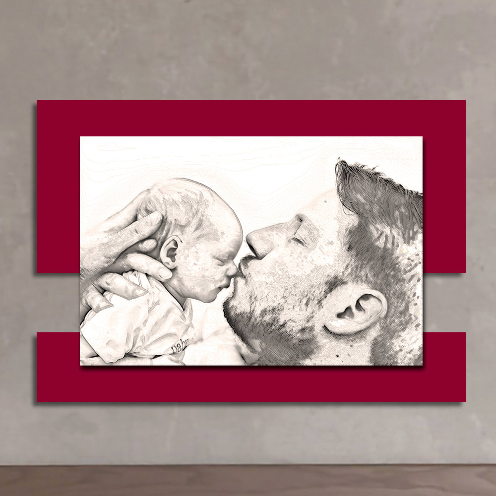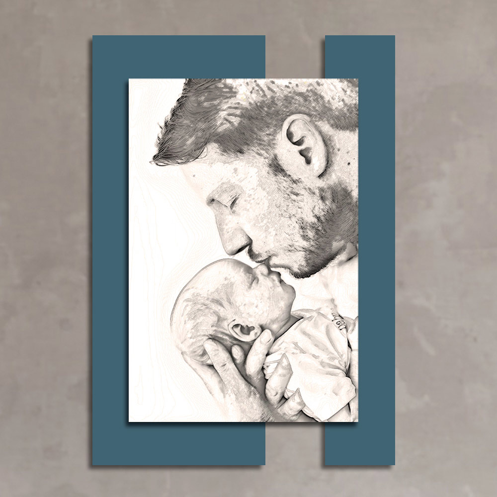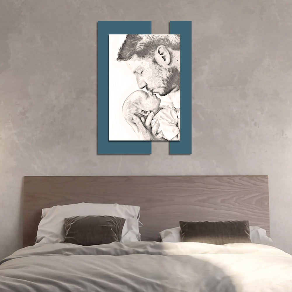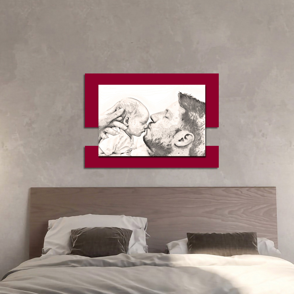 Panel íntegramente realizado en madera con estampado de un hombre besando a un niño. Casquillos para colgar tanto en horizontal como en vertical. La protección y el amor de un padre hacia su hijo se transmiten con intensidad en este cuadro, en el beso en la nariz y en cómo el padre mantiene sus manos entrelazadas detrás de la cabeza del niño. Los acabados, la madera elegida para la realización y la técnica de impresión resaltan toda la calidad de un elemento made in Italy que se presta a completar perfectamente el mobiliario de cualquier ambiente, dándole un ambiente cálido y acogedor.