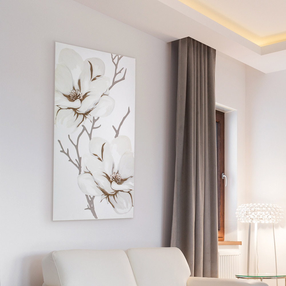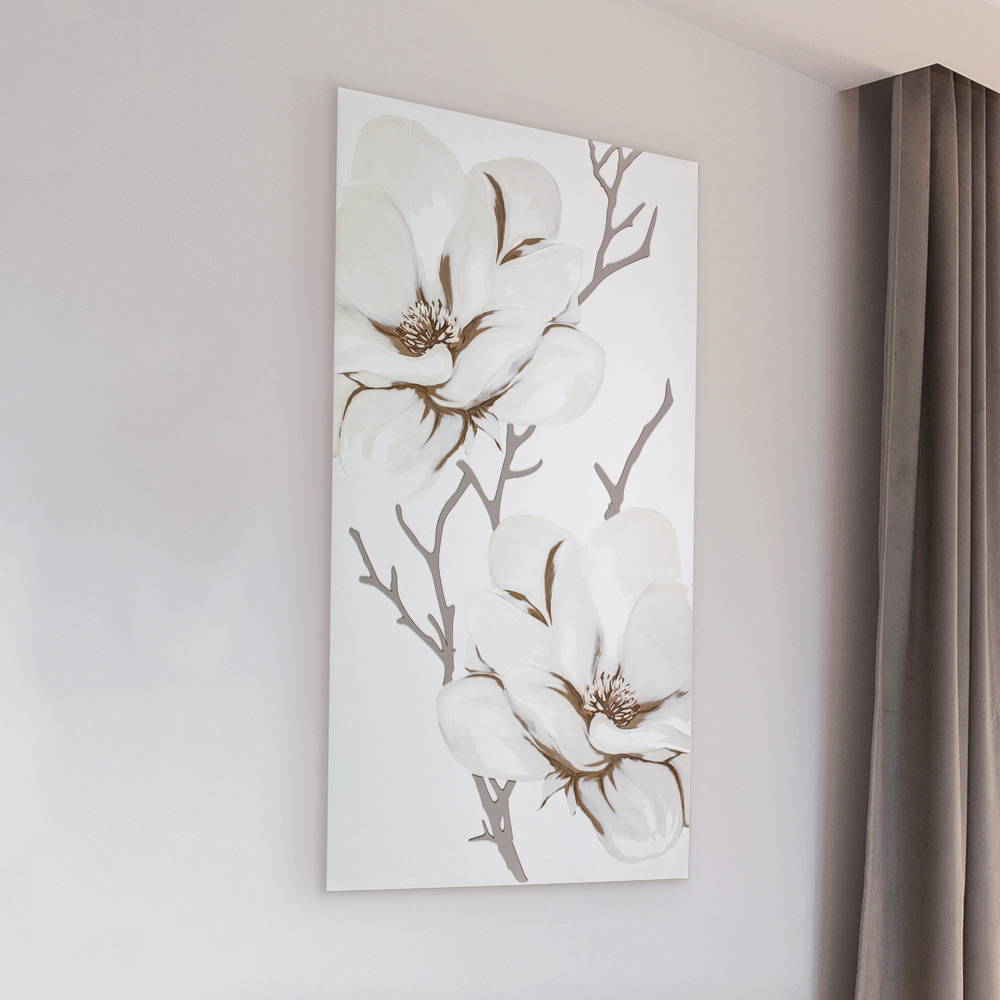 El panel con decoración está realizado mediante la técnica de marcado láser que crea un bajorrelieve en el material, creando diferentes gradaciones de color de los pétalos creados en el panel. El panel Magnolia está fabricado en madera lacada en blanco mate con aplicaciones en color guijarro . Un elegante mueble con dos delicadas flores de Magnolia, grabadas en detalle por láser con decoraciones en color guijarro.