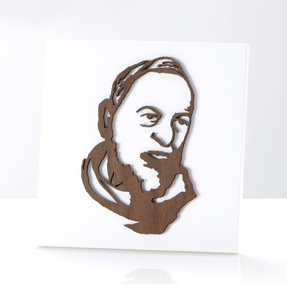 Cuadro Sagrado con el Padre Pío en madera wengé aplicada. Panel de madera lacado en blanco con pie de apoyo y orificio para colgarlo en la pared.