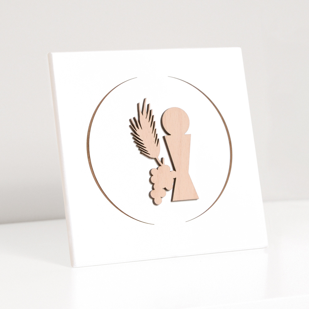 Sagrado cuadro con cáliz de comunión, espiga y uvas en madera natural aplicada y grabada con láser. Panel de madera lacado en blanco con pie de apoyo y orificio para colgarlo en la pared.
