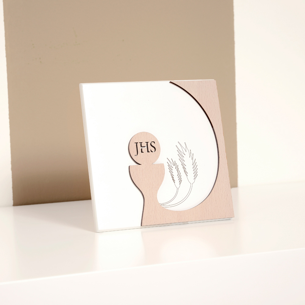 Cuadro Sagrado con símbolos de comunión aplicados en madera natural. Panel de madera lacado en blanco con pie de apoyo y orificio para colgarlo en la pared.
