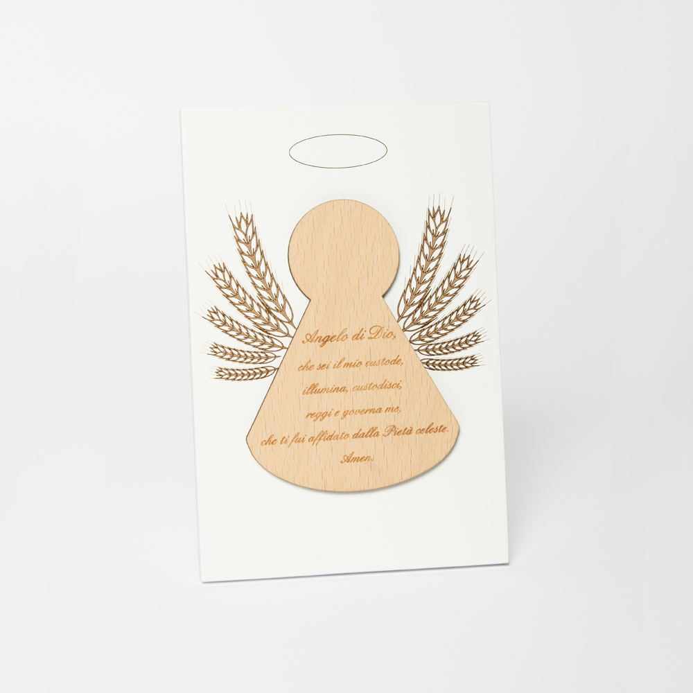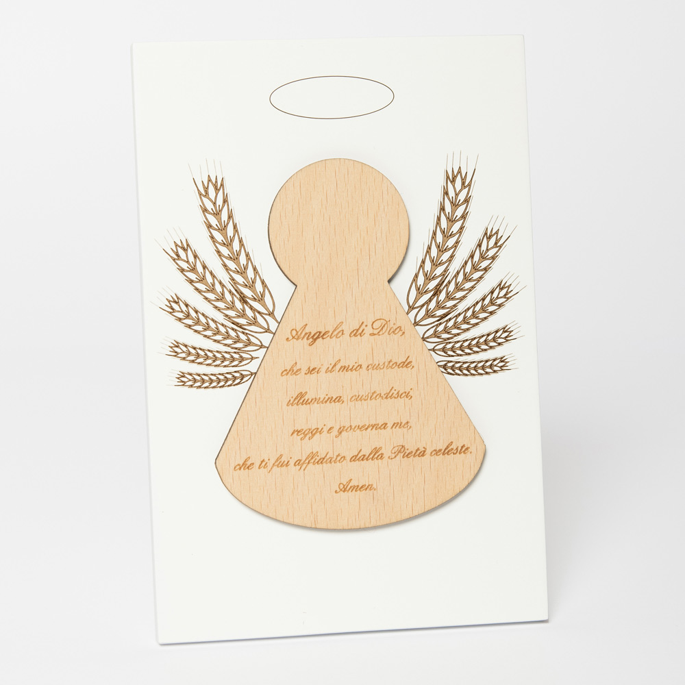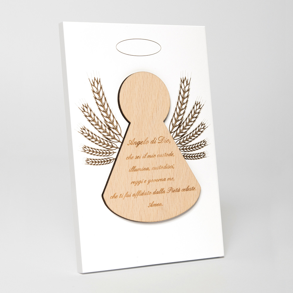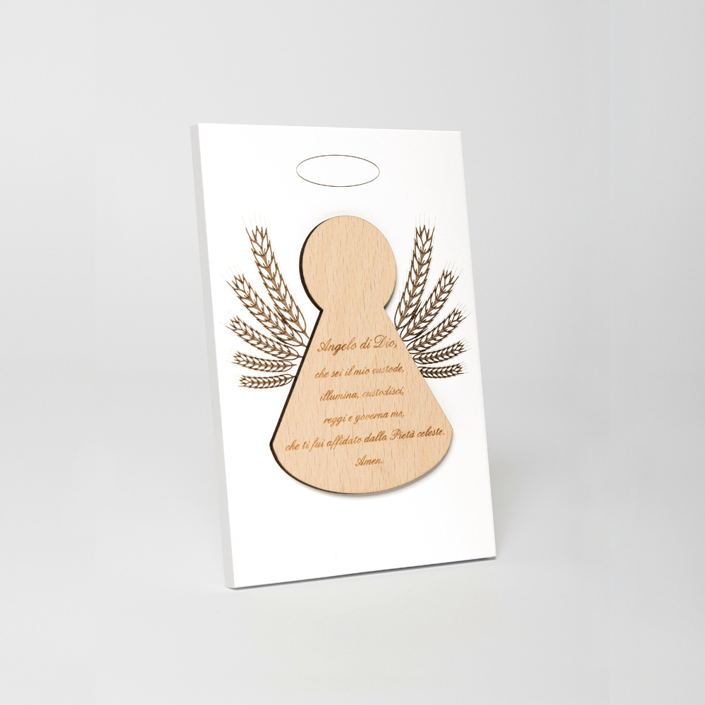 Cuadro sagrado con aplicación de un ángel con oración grabada. Panel de madera lacada en blanco con pie de apoyo. Aplicación en madera natural.