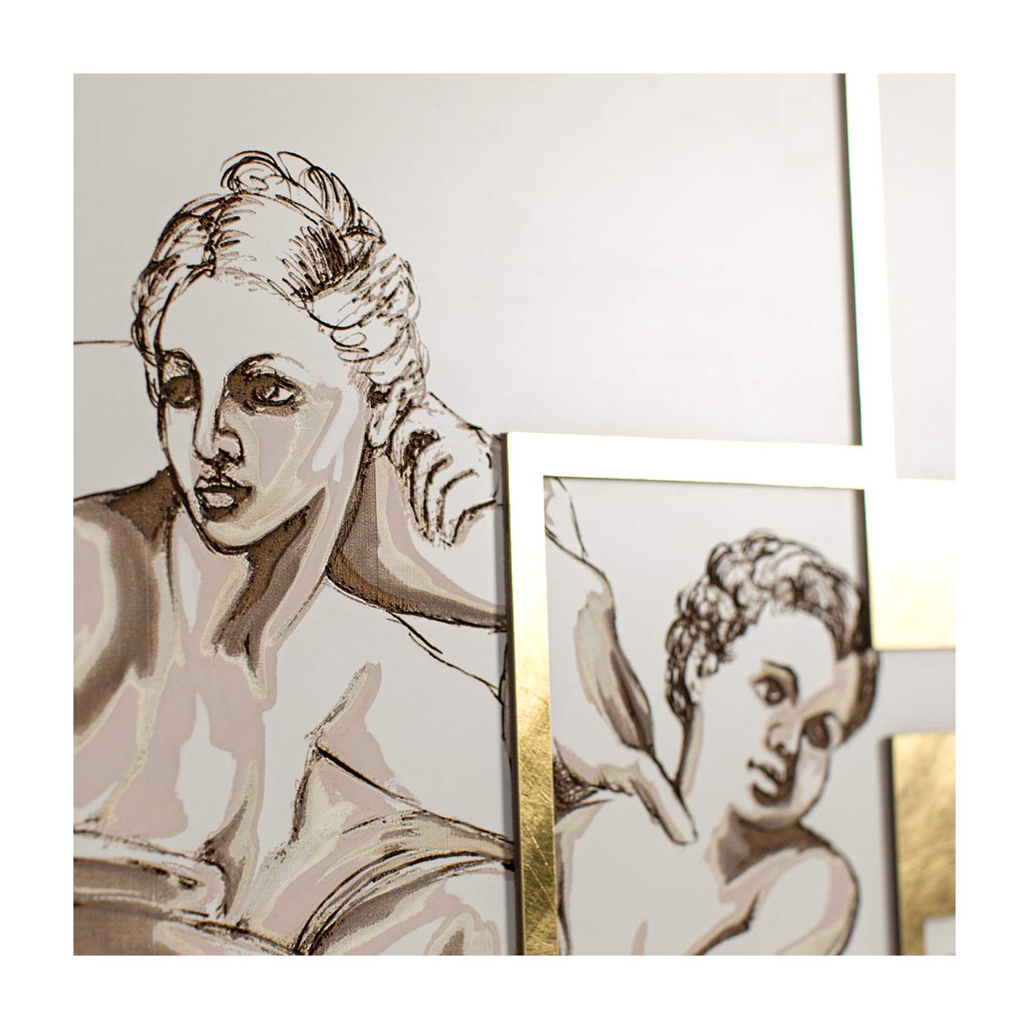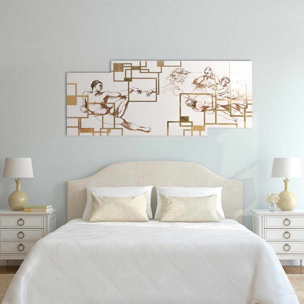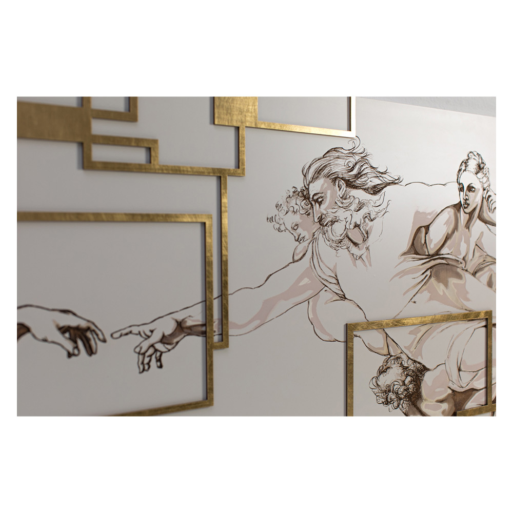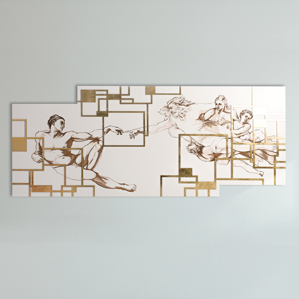El panel es un cabecero único que representa la pieza central del fresco de Miguel Ángel en la Capilla Sixtina, "La creación de Adán" . El fresco se informa hábilmente en los detalles más pequeños gracias al marcado láser que crea matices de color y profundidad . Estructura de madera lacada en blanco mate con marcado láser, una técnica especial que crea un bajorrelieve en los materiales.