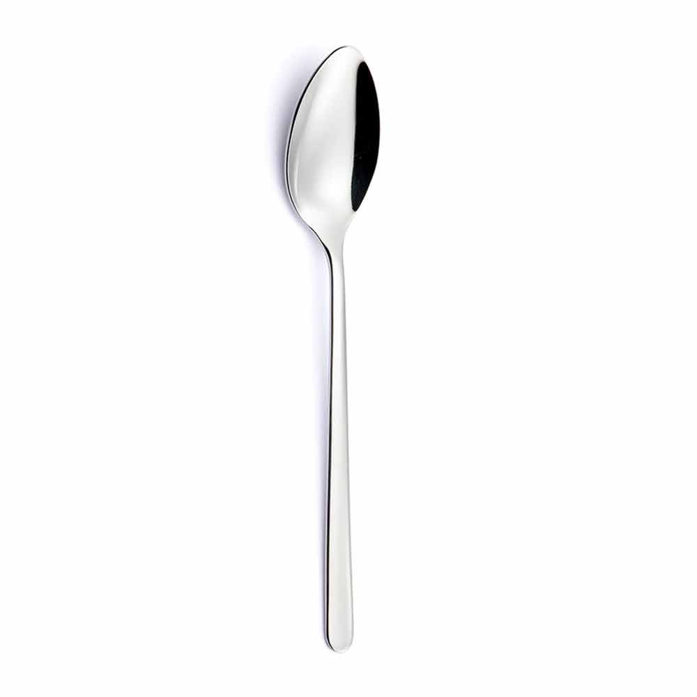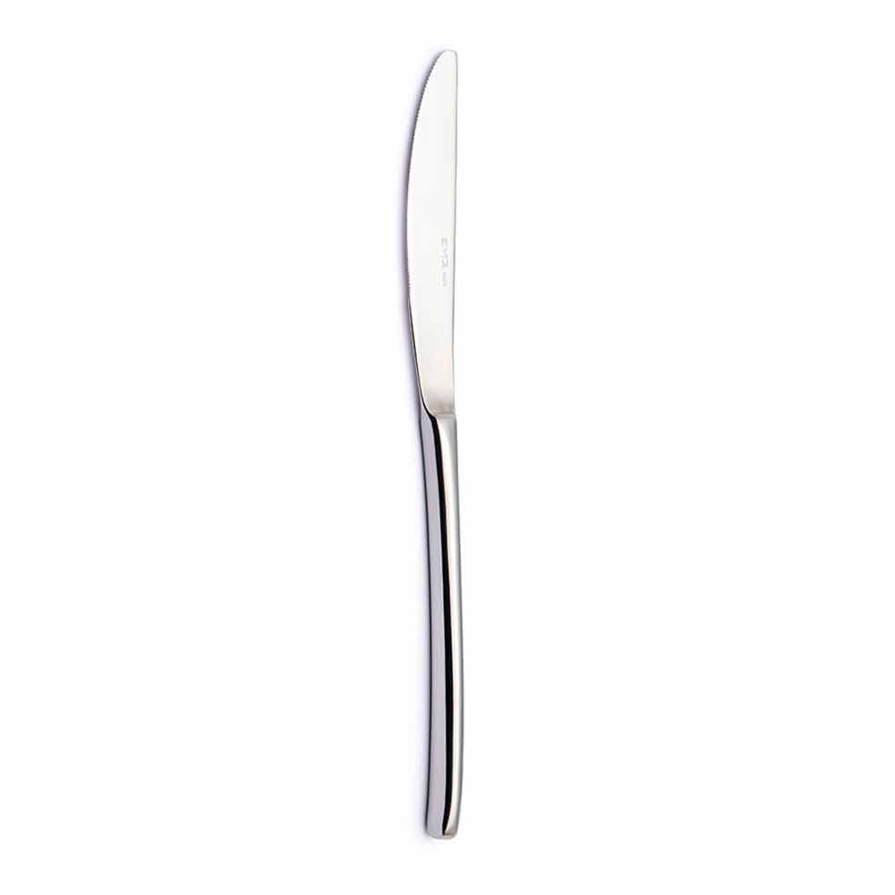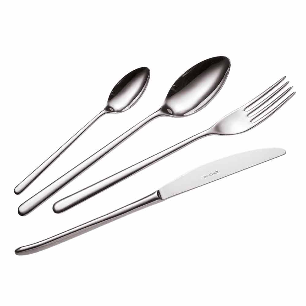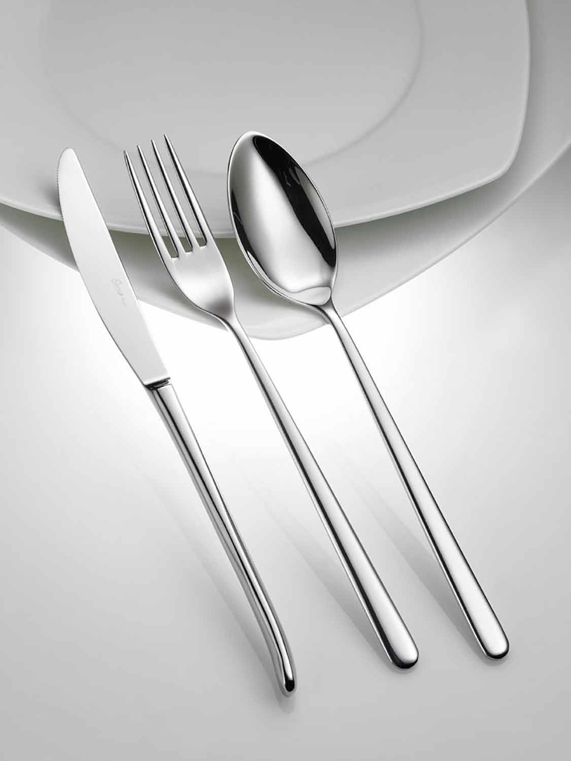 El servicio presenta líneas particularmente delgadas y delgadas . Los elementos distintivos de esta cubertería son la cuchara en forma de hoja y el cuchillo que también se puede colocar en el corte, que crean un diseño refinado obtenido también gracias a los extremos redondeados ligeros de los mangos y la atención al detalle .