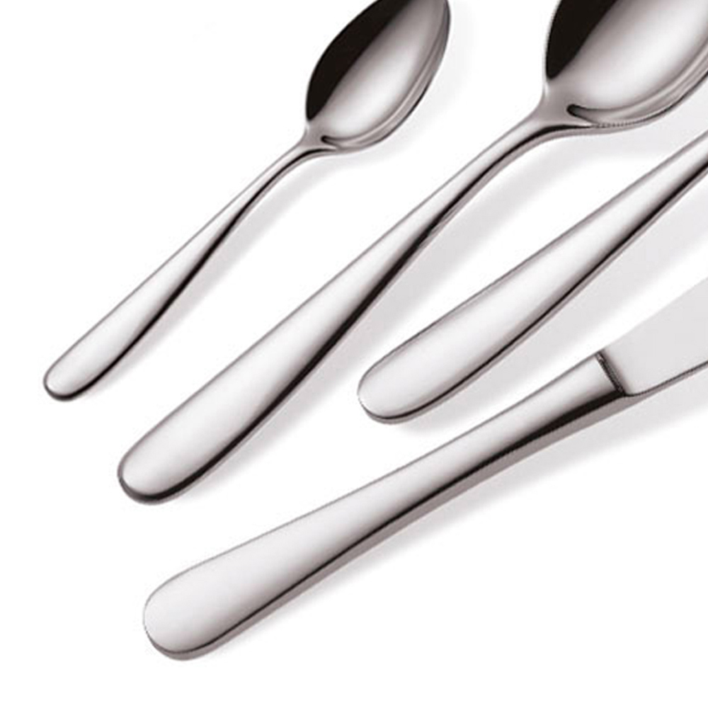 Juego completo de cubertería en acero inoxidable pulido, diseño minimalista moderno, 24 piezas made in Italy.