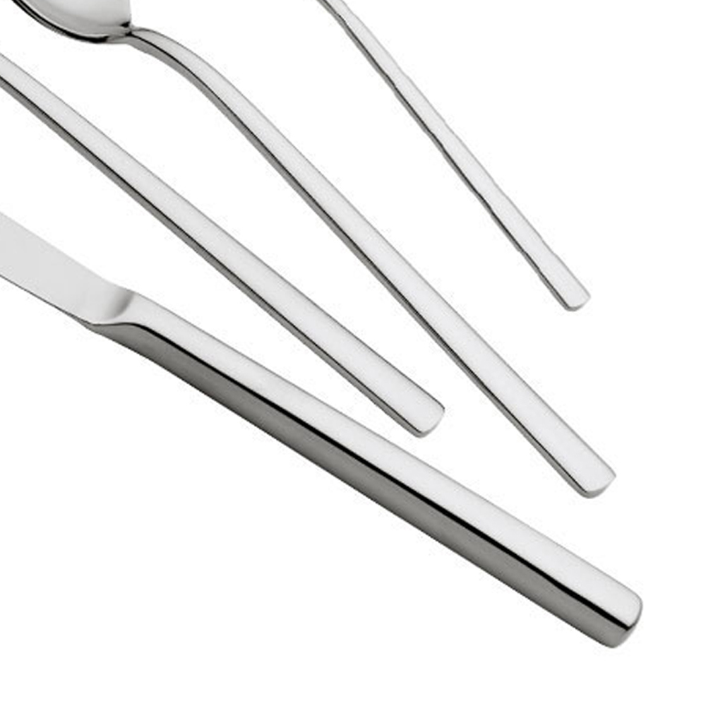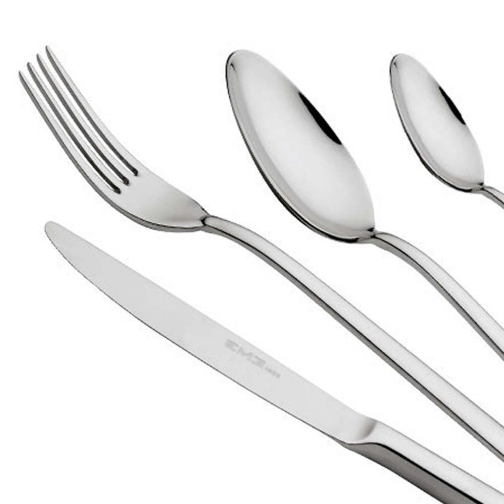 Cubertería de acero inoxidable pulido, diseño moderno y refinado, 24 piezas made in Italy.