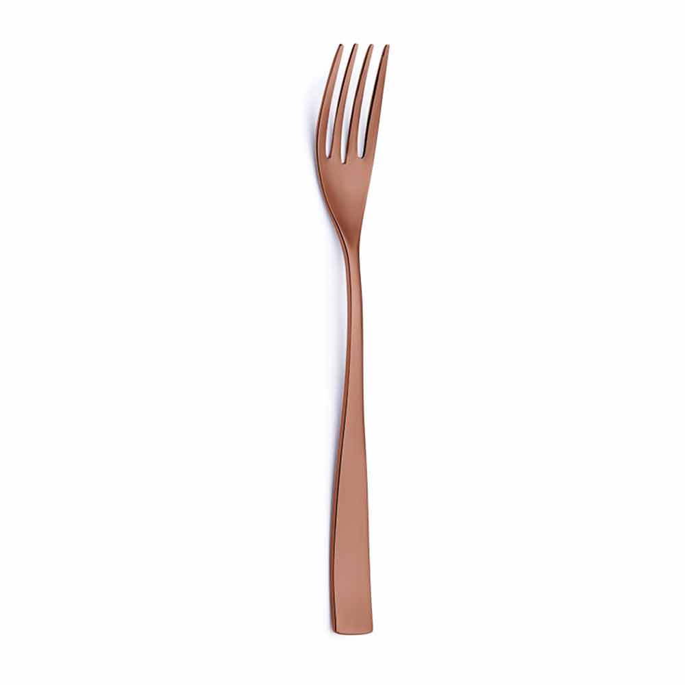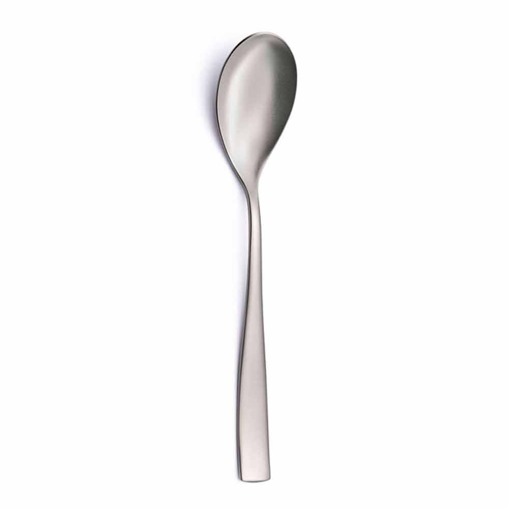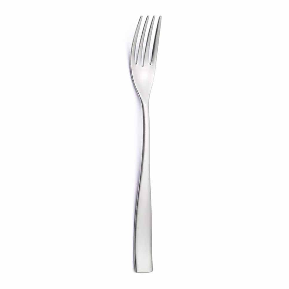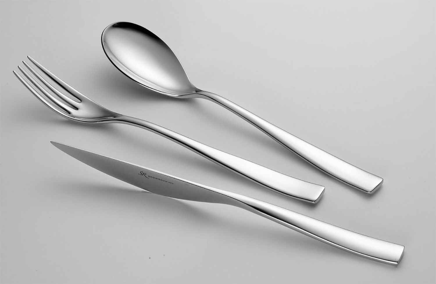 originalidad . La redondez de la cuchara y la sinuosidad del tenedor confieren a la serie más personalidad y contraste con la base ancha y plana de los mangos. El