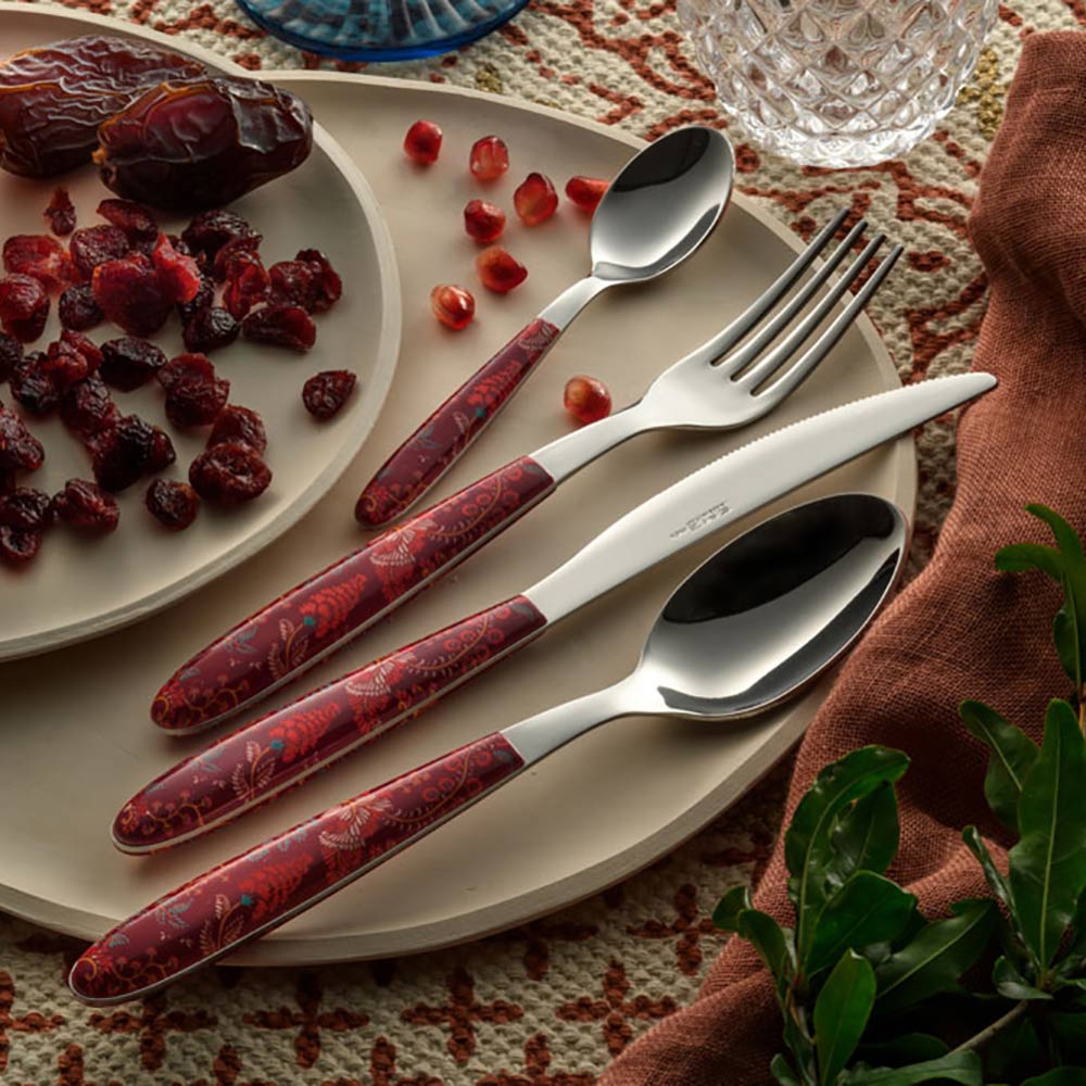 Juego de cubiertos en acero inoxidable y mango en plástico de color guilloché, 24 piezas made in Italy.