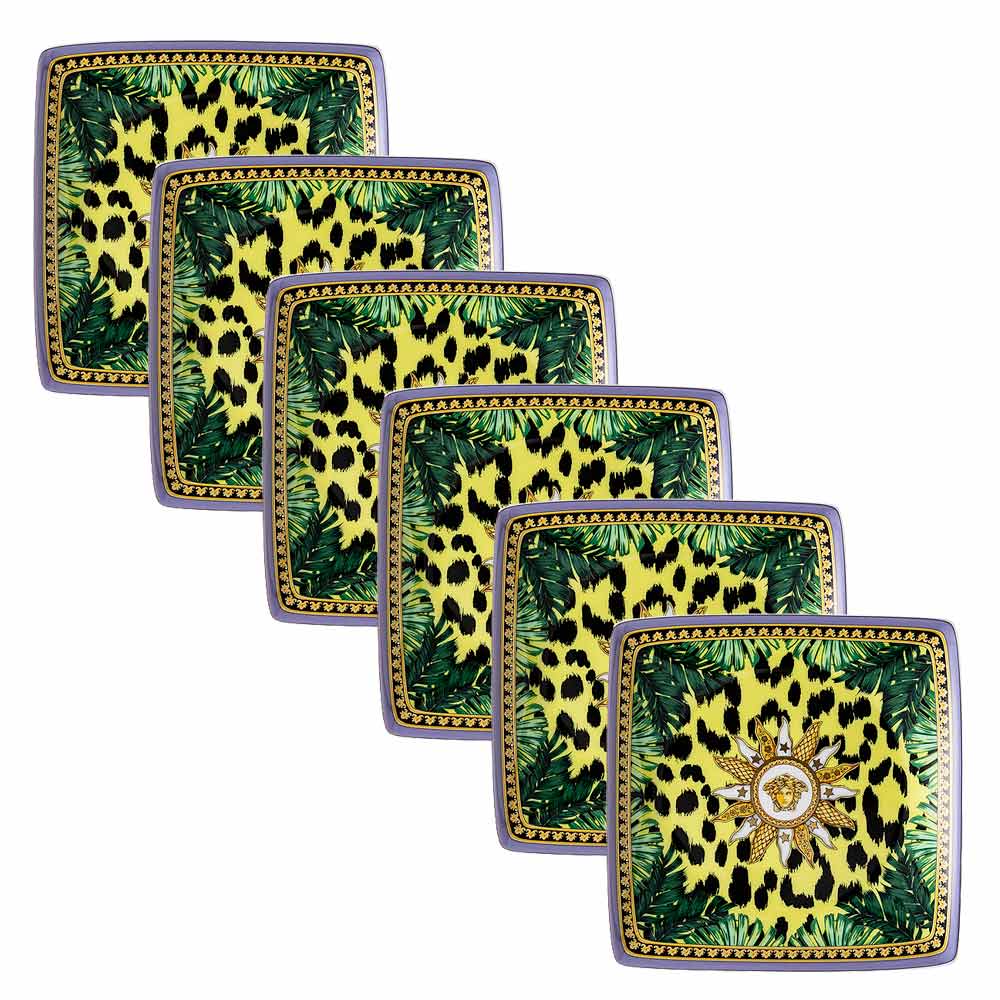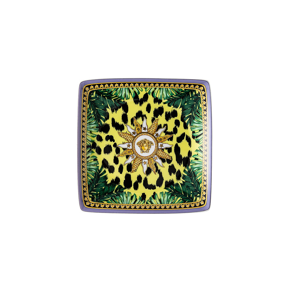 La taza Jungle Animalier de Versace , elaborada en porcelana fina , es una explosión de estilo y lujo salvaje . Su llamativo diseño combina un vibrante motivo animalier sobre un fondo amarillo, enmarcado por exuberantes hojas tropicales y dominado por el icónico símbolo de Medusa , bajo un sol dorado y adornado con detalles barrocos.