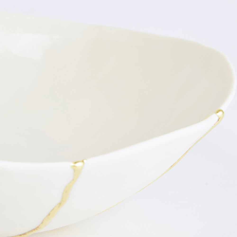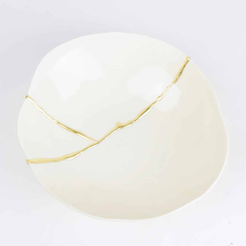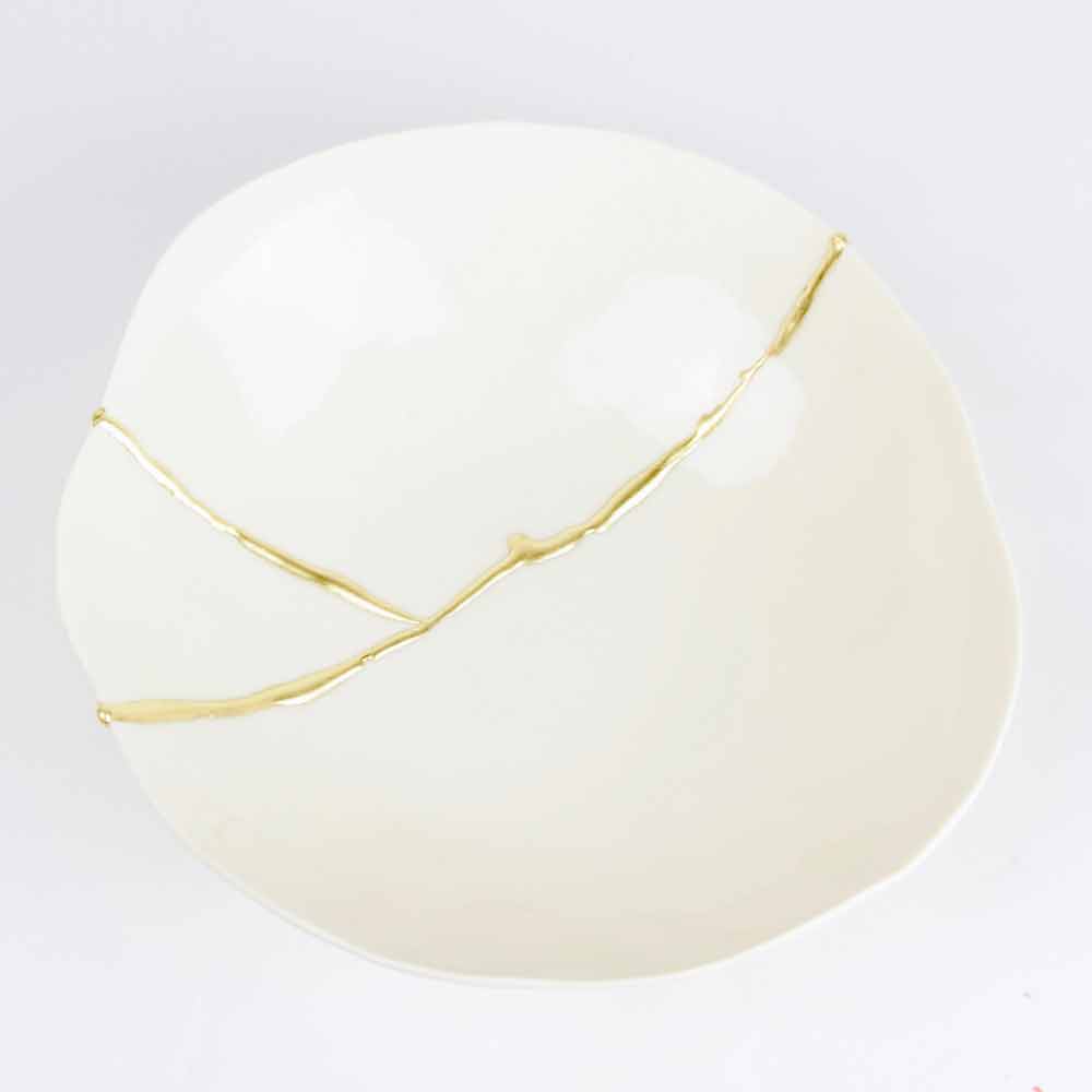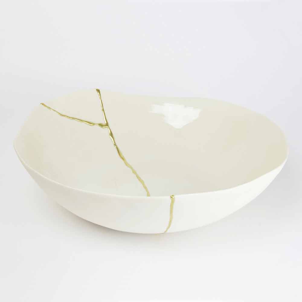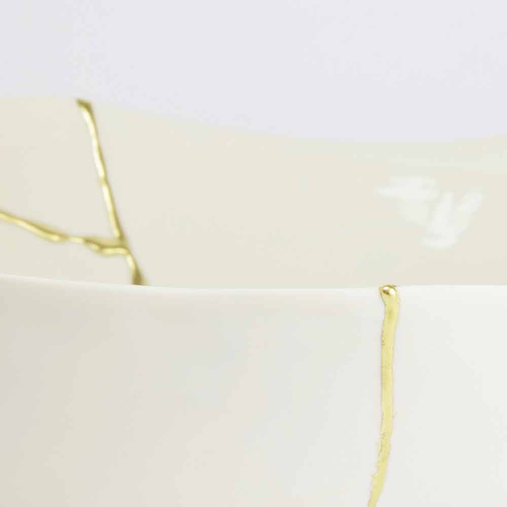 Elaborados con la más fina porcelana blanca , estos cuencos reflejan la filosofía japonesa del kintsugi que consiste en realzar, no ocultar, las heridas de la vida ya que son parte de nuestra historia y contribuyen a convertirnos en las personas que somos hoy. Así, cualquier objeto que salga dañado por la cocción en el horno se repara con pan de oro de 22 kilates como pegamento, que crea una maravillosa cicatriz preciosa.