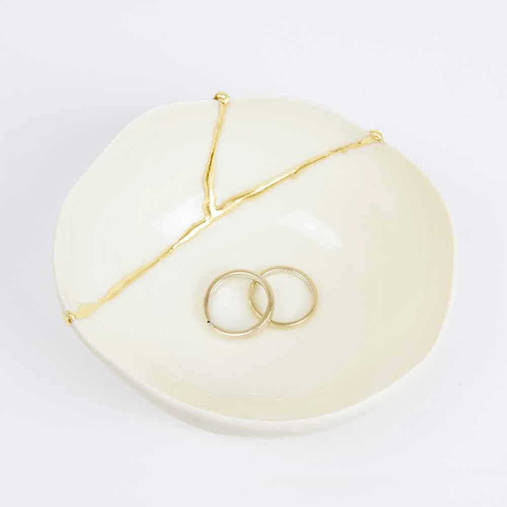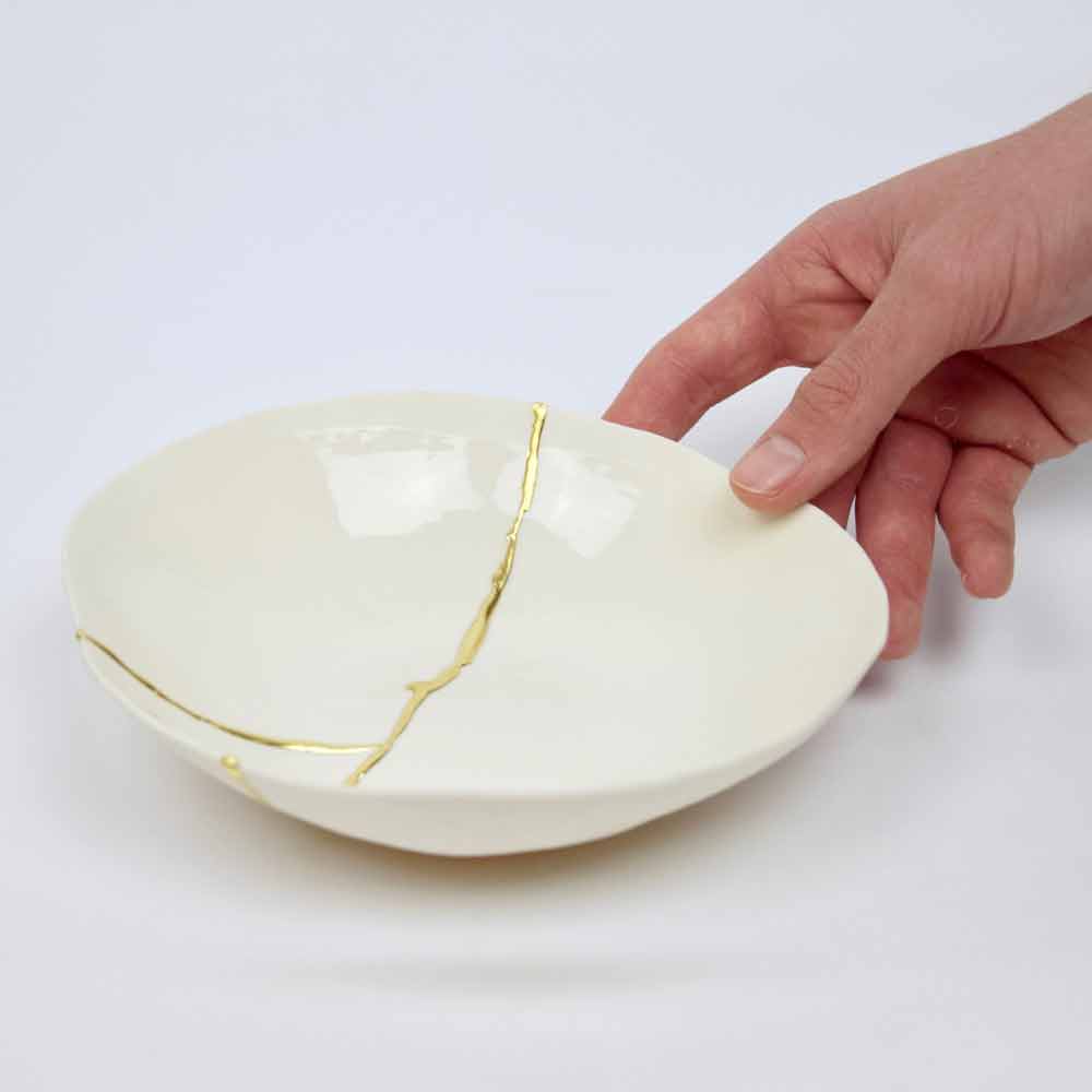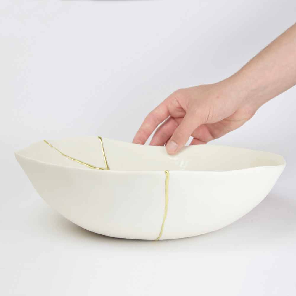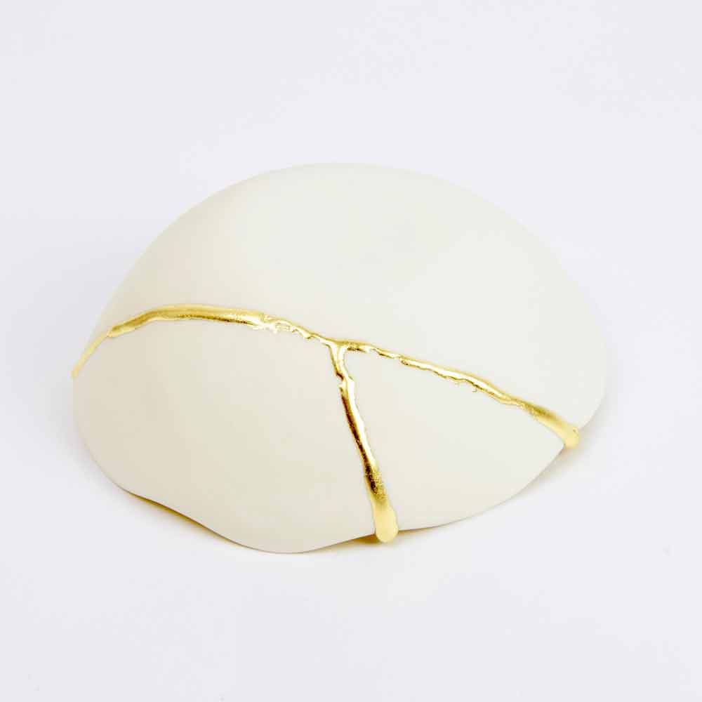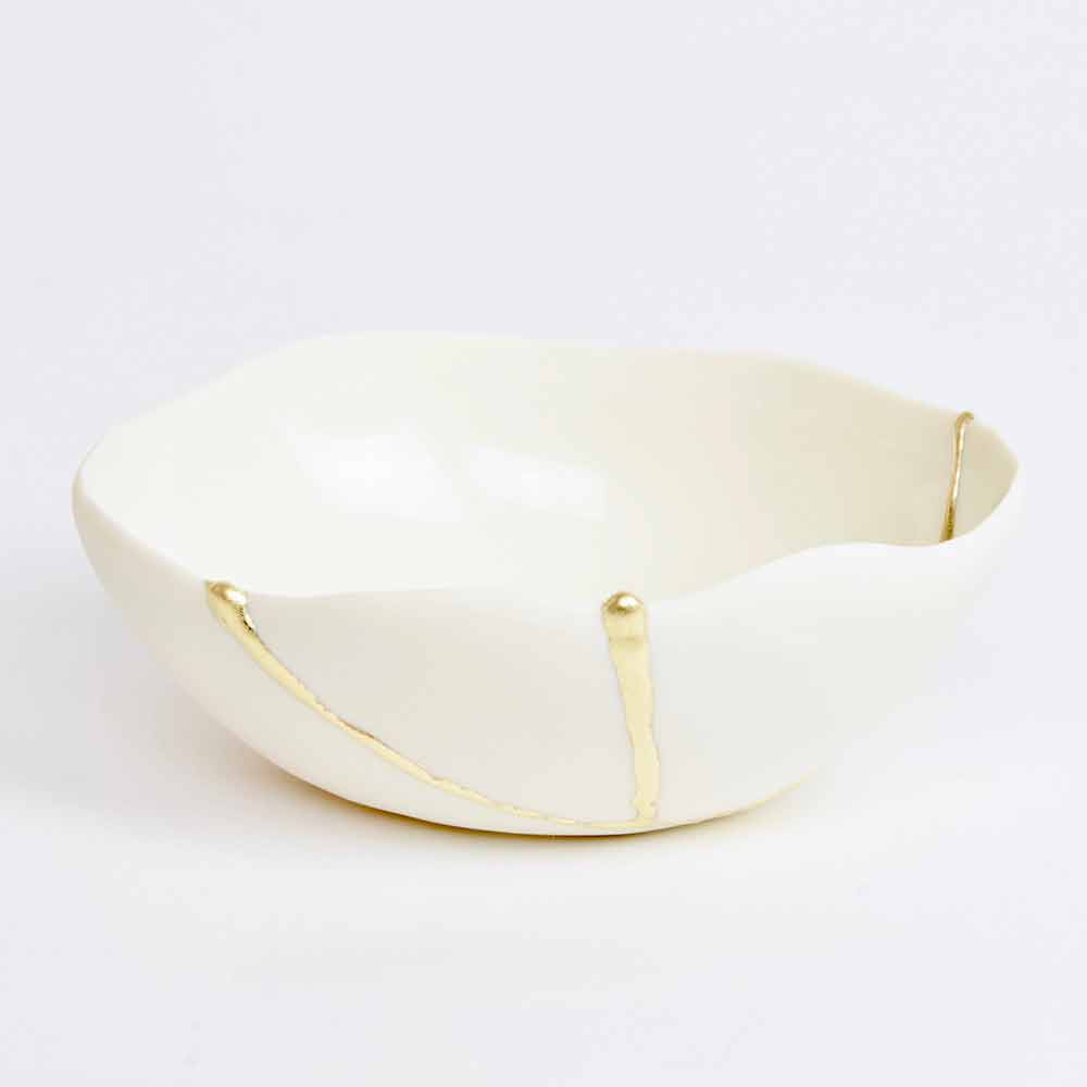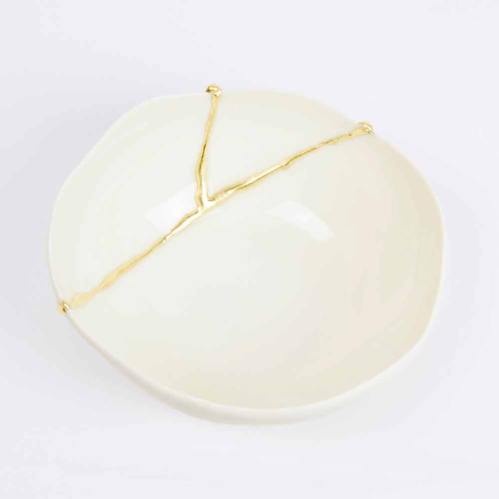 Elaborados con la más fina porcelana blanca , estos cuencos reflejan la filosofía japonesa del kintsugi que consiste en realzar, no ocultar, las heridas de la vida ya que son parte de nuestra historia y contribuyen a convertirnos en las personas que somos hoy. Así, cualquier objeto que salga dañado por la cocción en el horno se repara con pan de oro de 22 kilates como pegamento, que crea una maravillosa cicatriz preciosa.