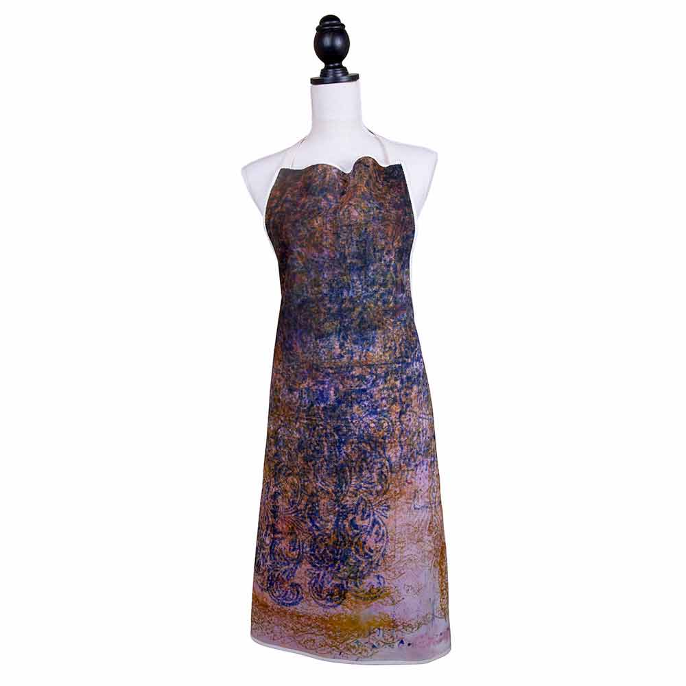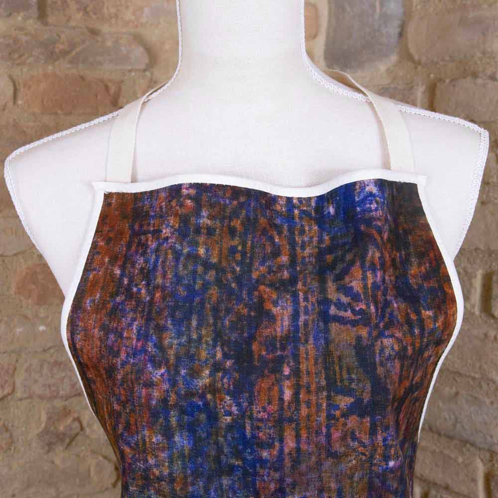 Delantal de cocina de alta artesanía con babero de algodón puro decorado con motivos artísticos de colores impresos a mano, pieza única de calidad hecha en Italia.