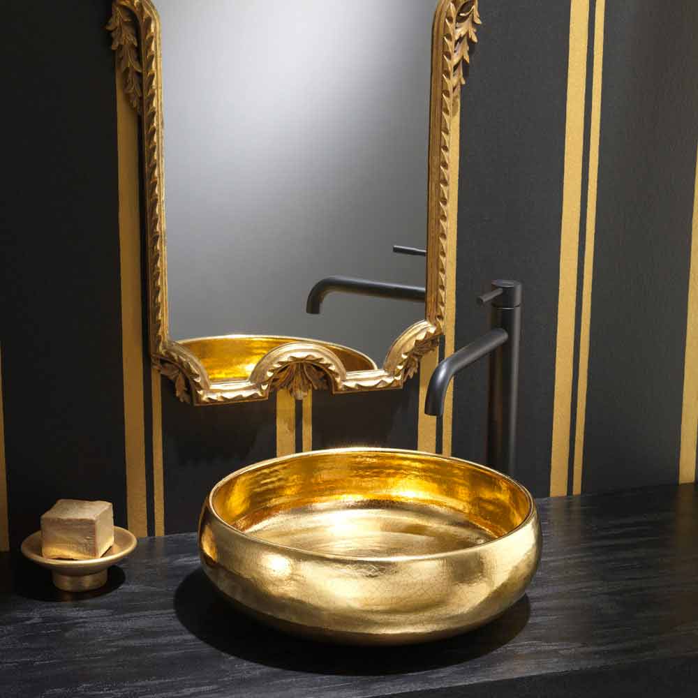 Fregadero empotrado de diseño en cerámica de oro raku hecho en Italia, Ramon Fregadero de la encimera del baño hecho a mano y convertido en Italia en cerámica raku con acabado de oro de 24k.