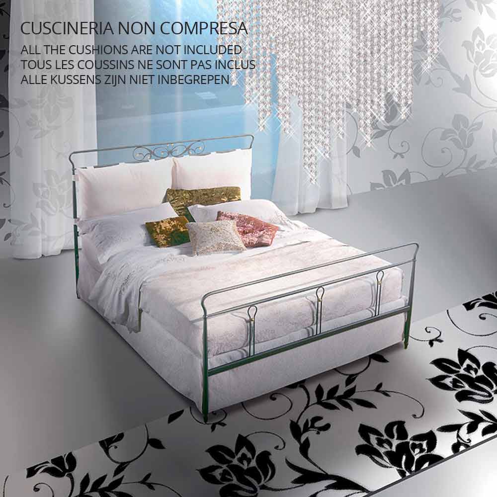 La cama de hierro forjado en la variante CABECERO DOBLE CON CONTENEDOR incluye un somier de láminas que puede alojar un colchón de 160 X 190 cm. El somier que suministramos tiene un sistema especial de retención del colchón que le permite alojar también un colchón de 190 cm de largo. En caso de que haya necesidades estéticas particulares, este modelo, gracias a nuestra productividad artesanal, se puede modificar en altura. El contenedor está fabricado íntegramente en metal y se puede pintar en cualquier color. Tener el contenedor de metal garantiza innumerables ventajas a nuestra cama entre las que se encuentran la solidez, la facilidad de limpieza y una mayor capacidad. El contenedor se puede combinar en cualquier caso con una cenefa textil.
