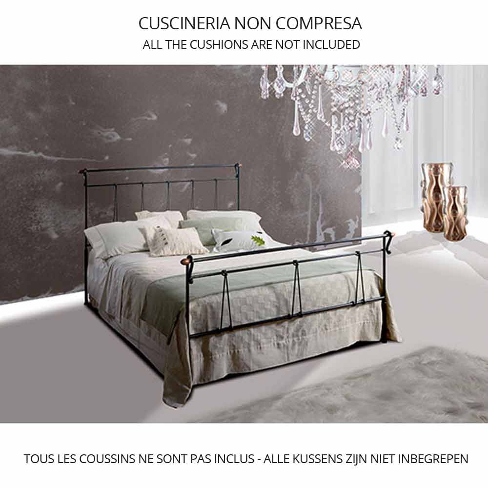 La cama de hierro forjado en la variante CABECERO DOBLE CON SOPORTE DE CAMA requiere la inserción de un somier de 160 X 190 que se debe aplicar apoyado sobre el somier. En caso de que existan necesidades particulares relacionadas con la conformación física, la combinación con somieres existentes o simplemente con la estética, este modelo, gracias a nuestra productividad artesanal, se puede modificar en altura, largo y ancho.