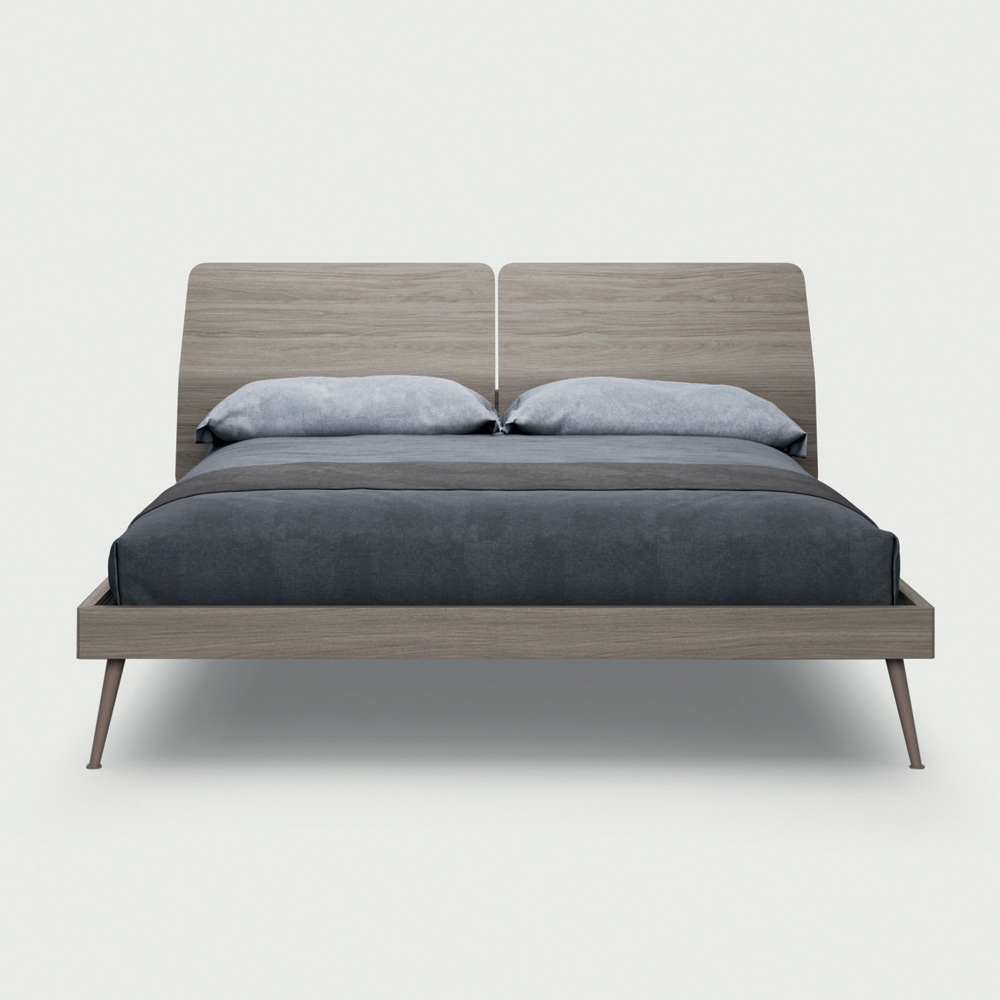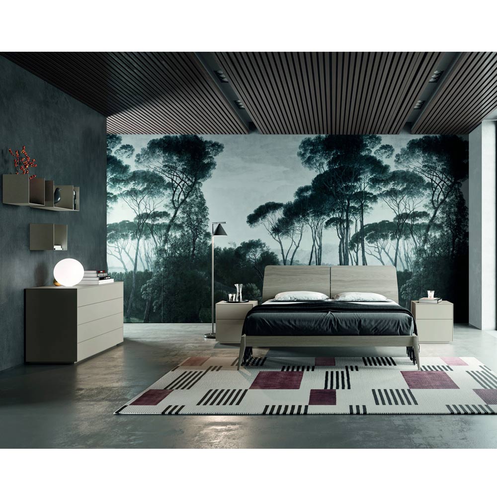 Mobiliario completo para dormitorio doble compuesto por 4 elementos íntegramente fabricados en Italia . La composición incluye una cama de matrimonio con estructura en chapa de fresno teñido con acabado oxidado con somier en material a juego y pies en madera pintada , 2 mesitas de noche y una cómoda de 4 cajones en acabado gris tórtola. Un diseño sobrio y elegante caracterizado por líneas simétricas y formas simples que se entrelazan para crear una idea de mobiliario contemporáneo revisada en clave romántica. La forma particular del cabecero de la cama enriquece la estética de la originalidad y el estilo, embelleciendo la habitación con un toque creativo. Los elegantes elementos que rodean la cama, protagonista indiscutible de la habitación, crean una perfecta armonía gracias a líneas sinuosas que acompañan al dormitorio con sencillez y ligereza.