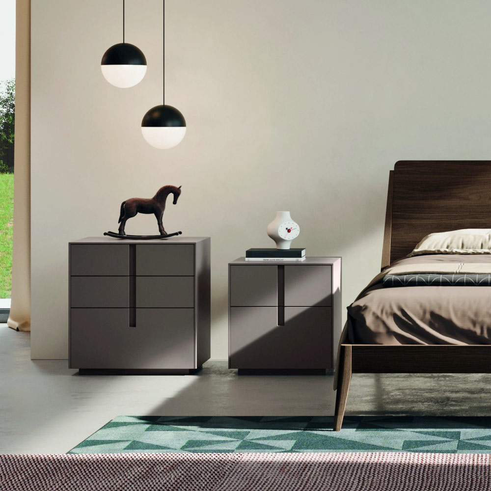 madera lacada mate con acabado barro dotadas de 2 prácticos cajones que se abren a través de una ranura colocada en el frente, una tercera mesita de noche y un cómoda con 3 cajones con el mismo sistema de apertura realizada en el mismo acabado. Esta solución combina