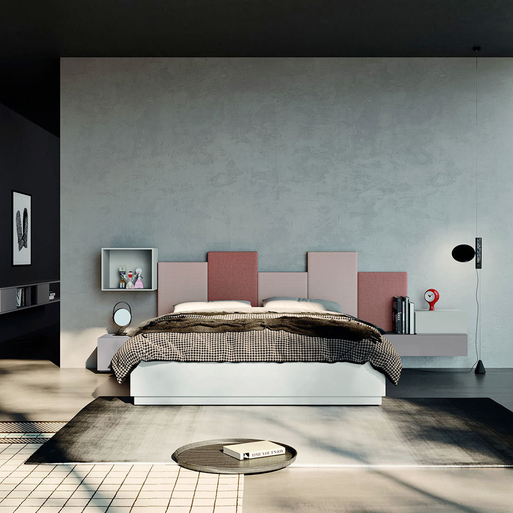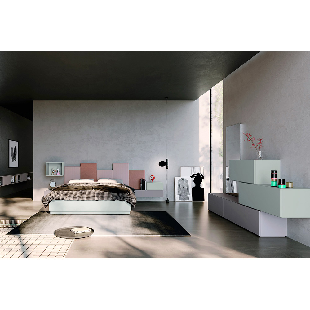 cama de matrimonio con estructura de madera lacada mate acabado pluma, dos mesitas de noche, una de ellas modular, una cómoda también modular y un mueble alto cuadrado de madera lacada mate con pluma y acabado hortensia. Una idea de decoración que ofrece infinitas posibilidades de soñar gracias a un