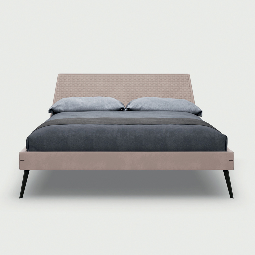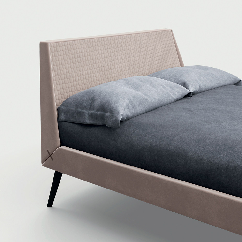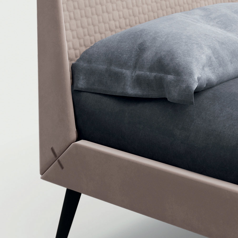 comodidad natural de forma y función . La cama está subrayada por dos niveles diferentes de acolchado que se unen en el cabecero que a su vez se une a la base decorada con maravillosas inserciones cosidas que embellecen sus formas. Los elementos que completan la composición enriquecen la estética del dormitorio con un