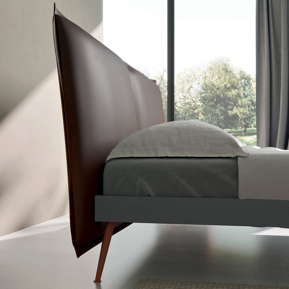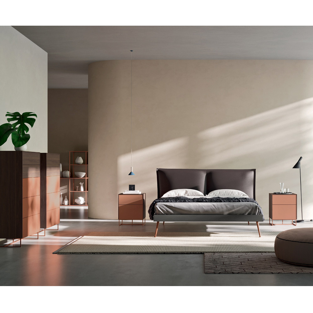 Mobiliario de dormitorio compuesto por 5 elementos íntegramente fabricados en Italia . La composición incluye una cama doble con un acabado mate marco de cama de madera, cabecera tapizada en eco-piel y los pies en la canela madera lacada, dos mesitas de noche (2 cajones) y dos en el pecho de cajones (5 cajones) en el mismo color que los pies de la cama enriquecida con detalles en acabado terracota texturizado. De la particular atención a los detalles y el equilibrio de formas y materiales , nace un estilo de decoración para el dormitorio, caracterizado por un minimalismo refinado y rico en detalles como la armonía entre la base de los componentes y el pie de la cama. Este último se viste de nuevas tonalidades encontrando el compromiso perfecto entre elegancia y frescura y dando así vida a una solución de decoración exclusiva con una fuerte personalidad moderna .
