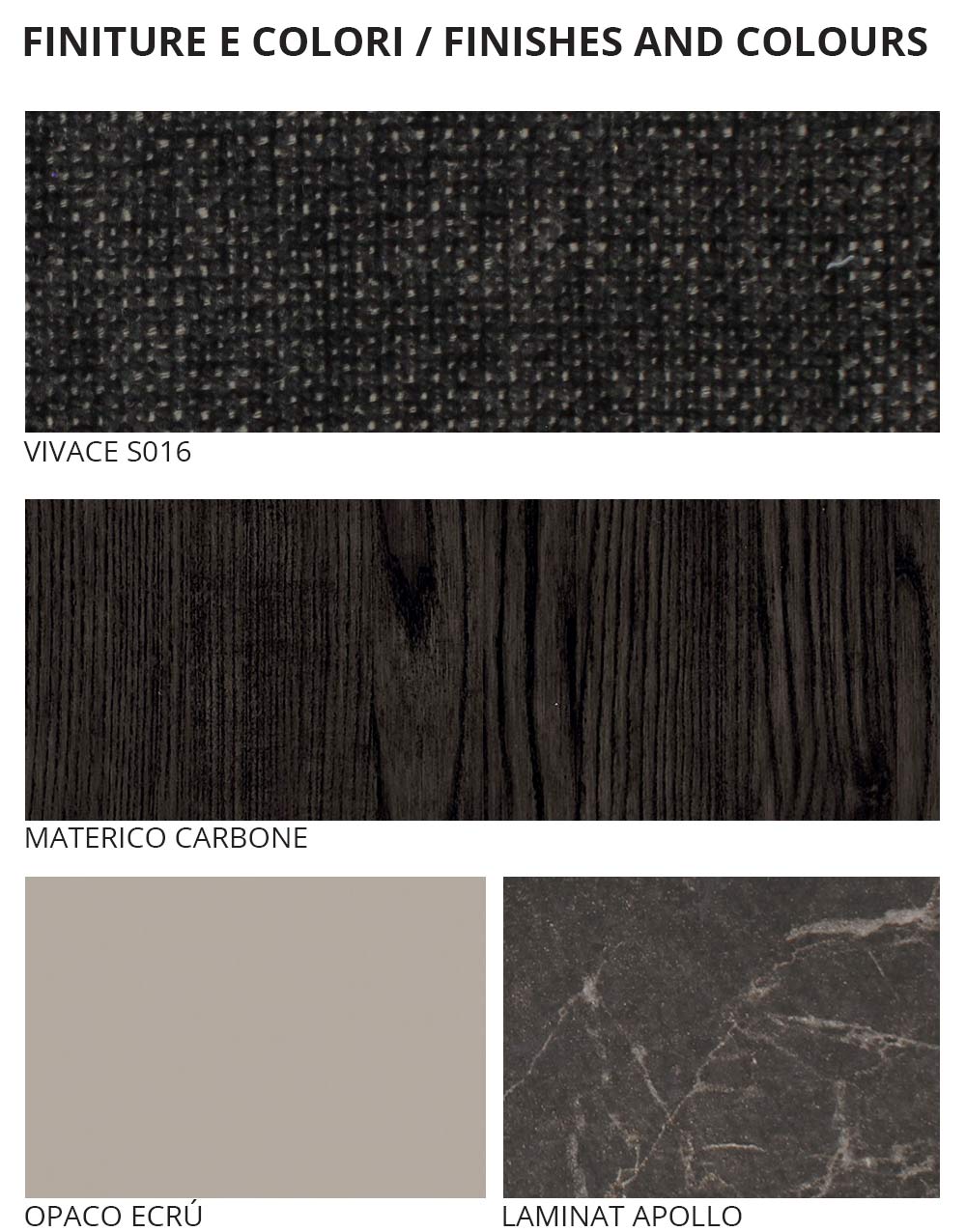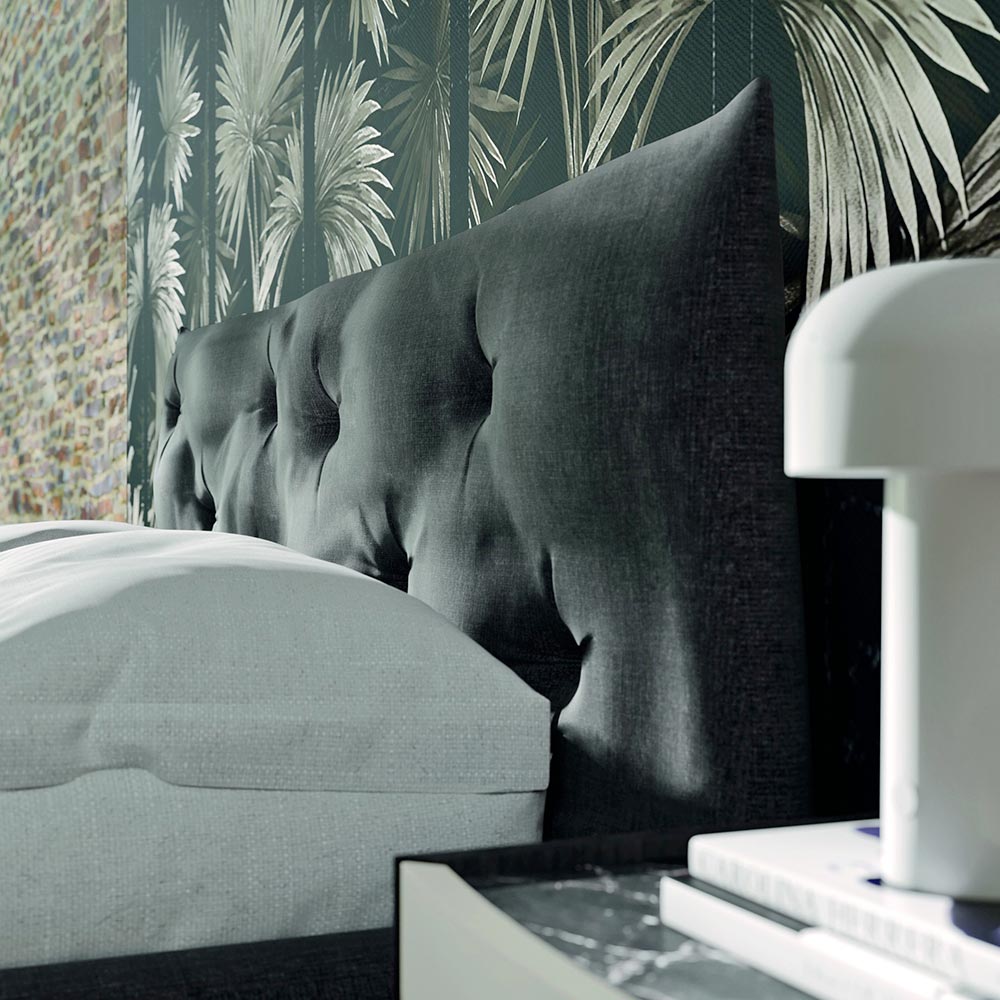 Mobiliario de dormitorio doble compuesto por 4 elementos íntegramente fabricados en Italia . La composición incluye una cama doble con bastidor de la cama acolchado y cabecera tapizada en tejido (extraíble), dos mesitas de noche con 2 cajones cada uno y un pecho de 3 cajones de cajones en madera con acabado de material de carbón con detalles en lacado mate madera con acabado de color crudo y estantes en laminado apollo acabado. Una cama suave y acogedora caracterizada por una presencia importante e imponente y por el particular procesamiento que mueve la suavidad del cabecero, conquistando la zona de descanso con su personalidad moderna . Los elementos que completan la estética de la habitación permiten crear un ambiente acogedor y envolvente, asegurando un descanso de calidad para quienes allí habitan.