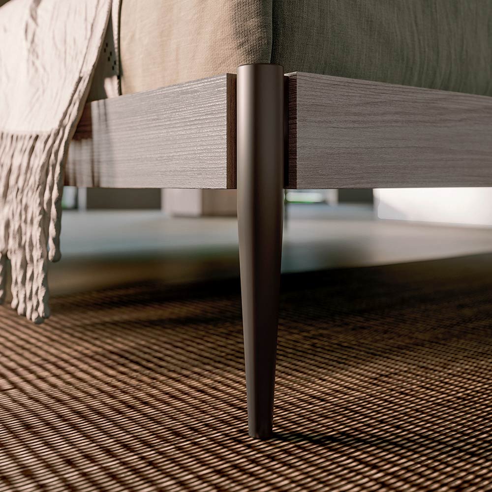 Dormitorio doble con 4 elementos totalmente fabricado en Italia . La composición incluye una cama de matrimonio con cabecero y estructura de cama en madera con acabado material oxidado y pies en metal bruñido , 2 mesitas de noche de 2 cajones cada una y una cómoda alta de 6 cajones en madera con acabado material oxidado y lacado pluma mate. La cama se convierte en protagonista del mobiliario gracias a su grandiosidad y su diseño que reelabora en clave contemporánea una referencia al gusto retro caracterizado por una combinación perfecta de accesorios ligeramente redondeados que dan vida a una comodidad y una acogida que pertenecen a un pasado estilo. La particular configuración que enriquece los frontales de las mesitas de noche y de la cómoda permite que la estancia adquiera aún más autenticidad gracias a un original juego de contrastes con diferentes colores y acabados.
