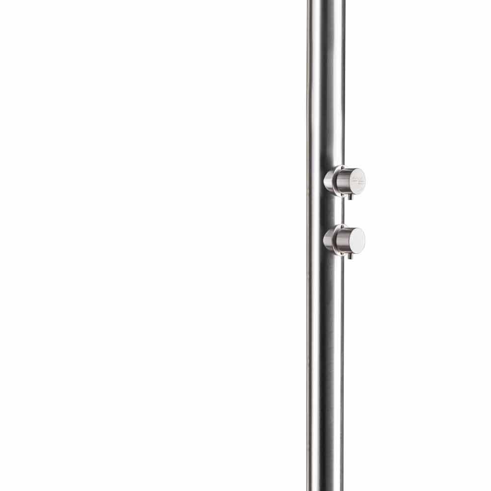 Ducha de jardín de agua fría y caliente de acero inoxidable con acabado pulido y lavapiés. Fabricada en Italia.
