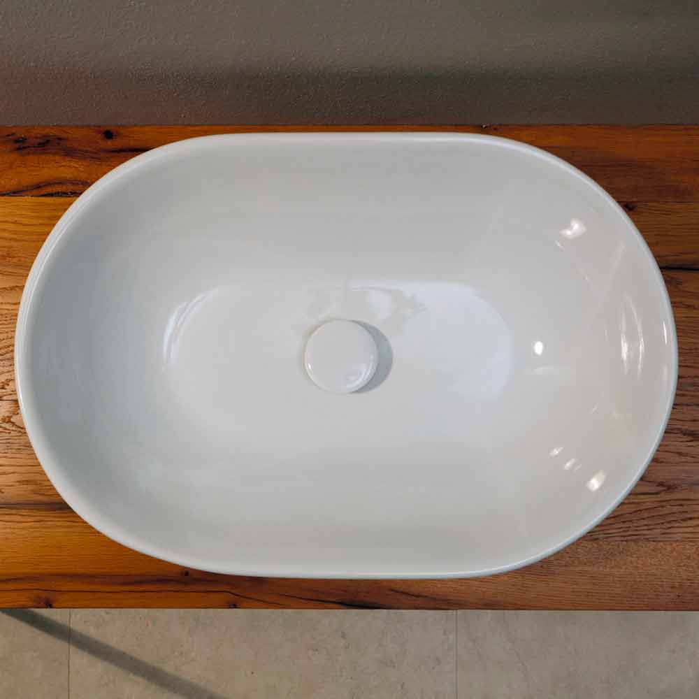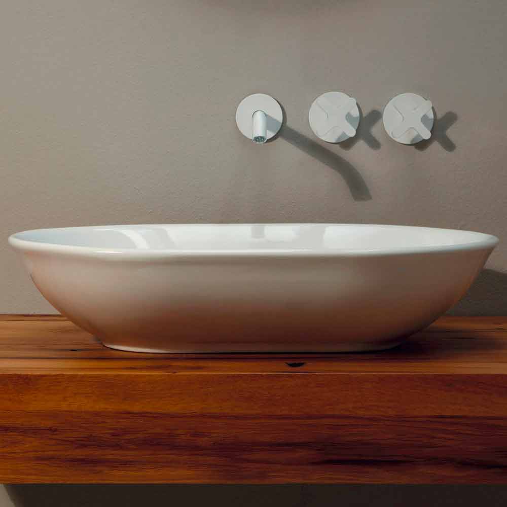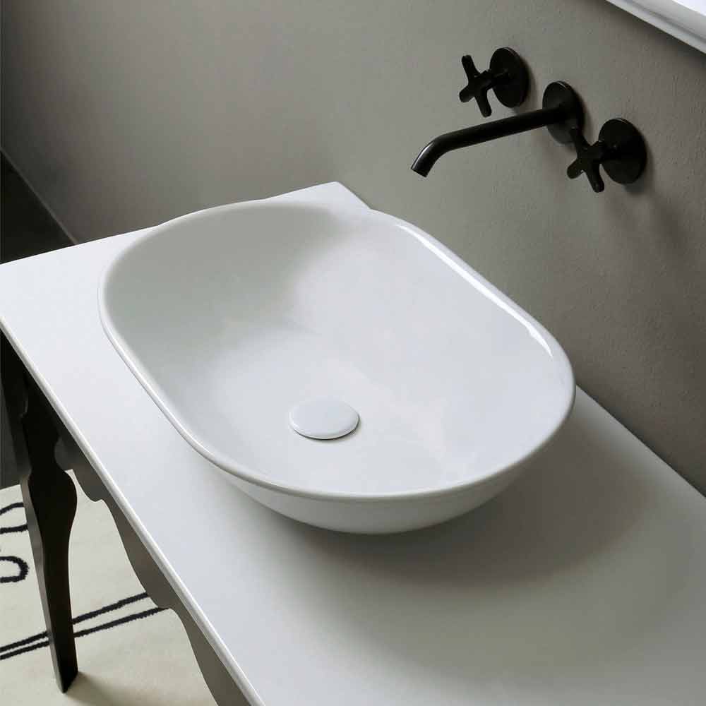 Lavabo sobre encimera de cerámica de diseño moderno hecho en Italia Lavabo de diseño que recuerda el arquetipo de la taza del inodoro. Su forma alargada realza su función. Adecuado para quienes desean una forma romántica con un ligero sabor retro.