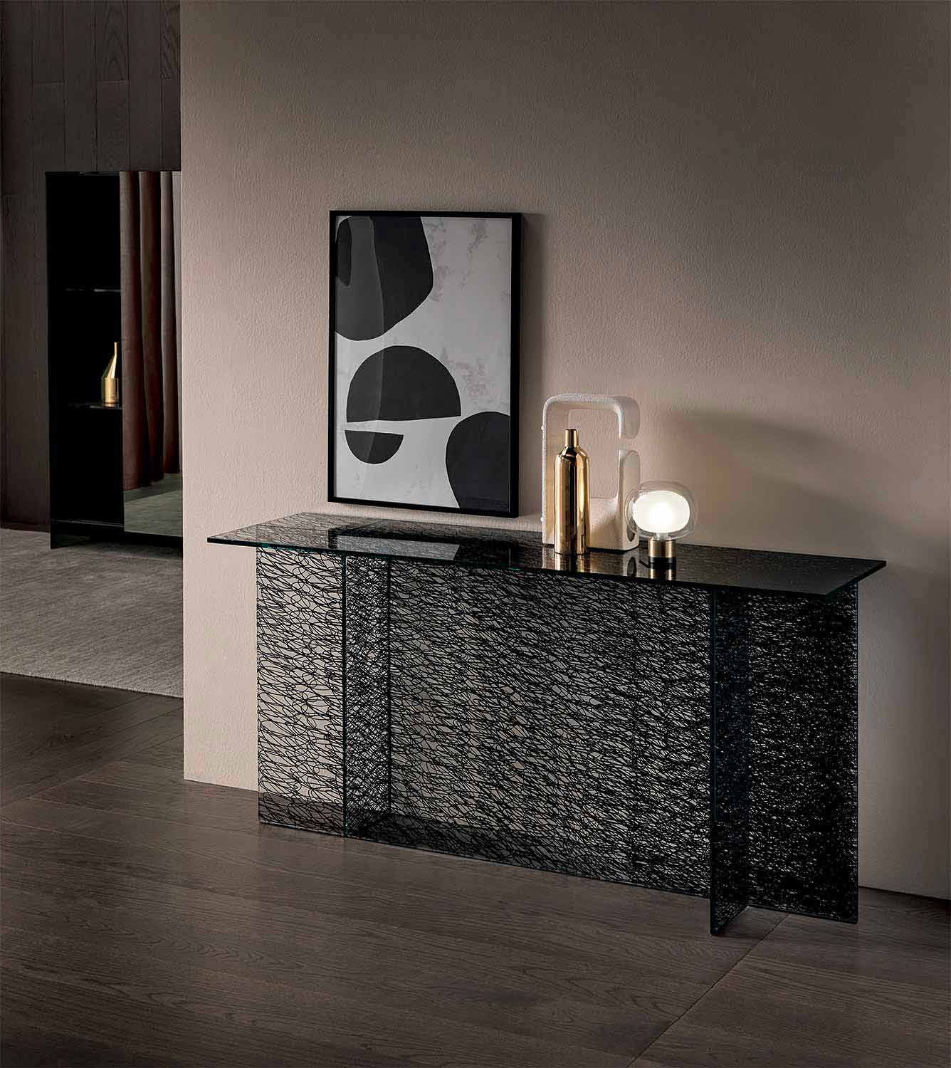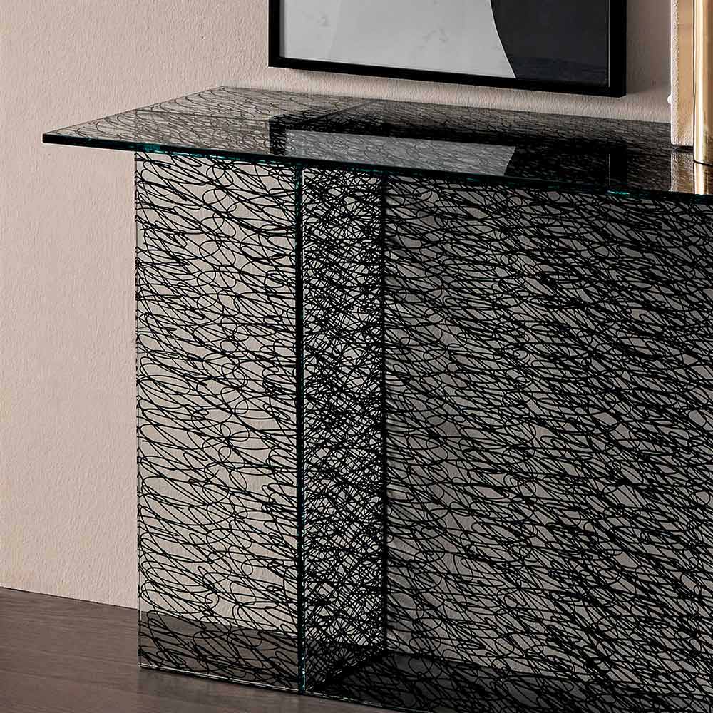 Consola de diseño moderno en vidrio decorado trasparente, realizado a mano en Italia.