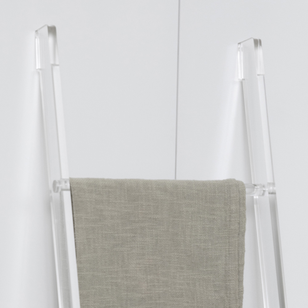 Esta escalera de diseño es un mueblefabricado íntegramente en cristal acrílico transparente de 15 mm de espesor con un diseño versátil , que se puede utilizar perfectamente como toallero en el baño. El cristal acrílico es el polímero de metacrilato que se caracteriza por la pureza de su transparencia que supera al cristal natural.