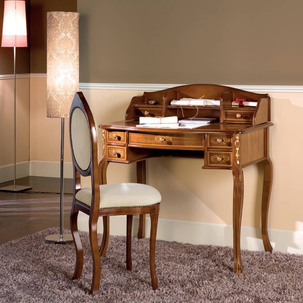 Escritorio de estilo clásico realizado en preciosa madera acabado nogal con elegantes incrustaciones doradas completo con 7 cajones y una práctica balda . Ideal para amueblar con elegancia cualquier ambiente. Un complemento único y refinado, realizado íntegramente en Italia por expertos maestros artesanos , acabado con sabiduría y gusto por la elegancia. La producción se lleva a cabo utilizando materiales nobles y realizando el trabajoamano con el máximo cuidado y profesionalismo que distingue a los productos Made in Italy .